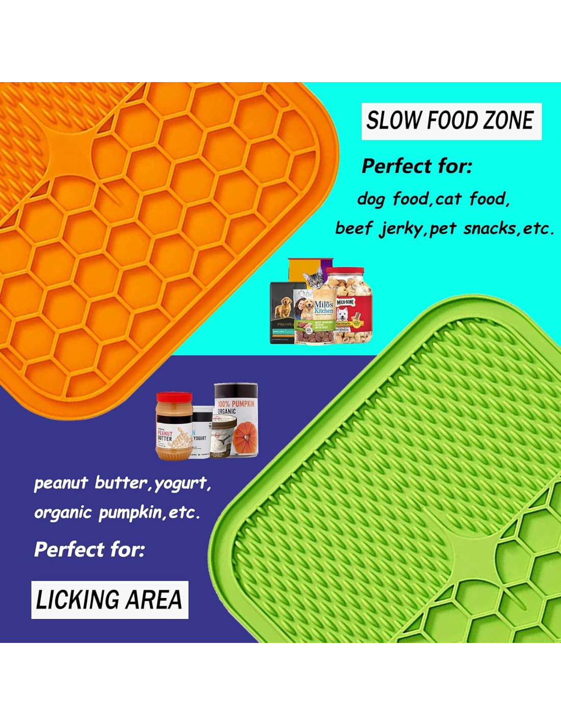 - Dos Texturas Diferentes: Las alfombrillas para lamer perros Kwispel están diseñadas de manera innovadora con dos particiones. Una se utiliza como alfombrilla para lamer alimentos líquidos como mantequilla de maní, calabaza o yogur, y la otra se utiliza como alfombrilla de alimentación lenta para alimentos secos, como alimentos para perros, alimentos para gatos, carne seca, golosinas para mascotas, etc. Una alternativa divertida a los cuencos de alimentación lenta para perros.