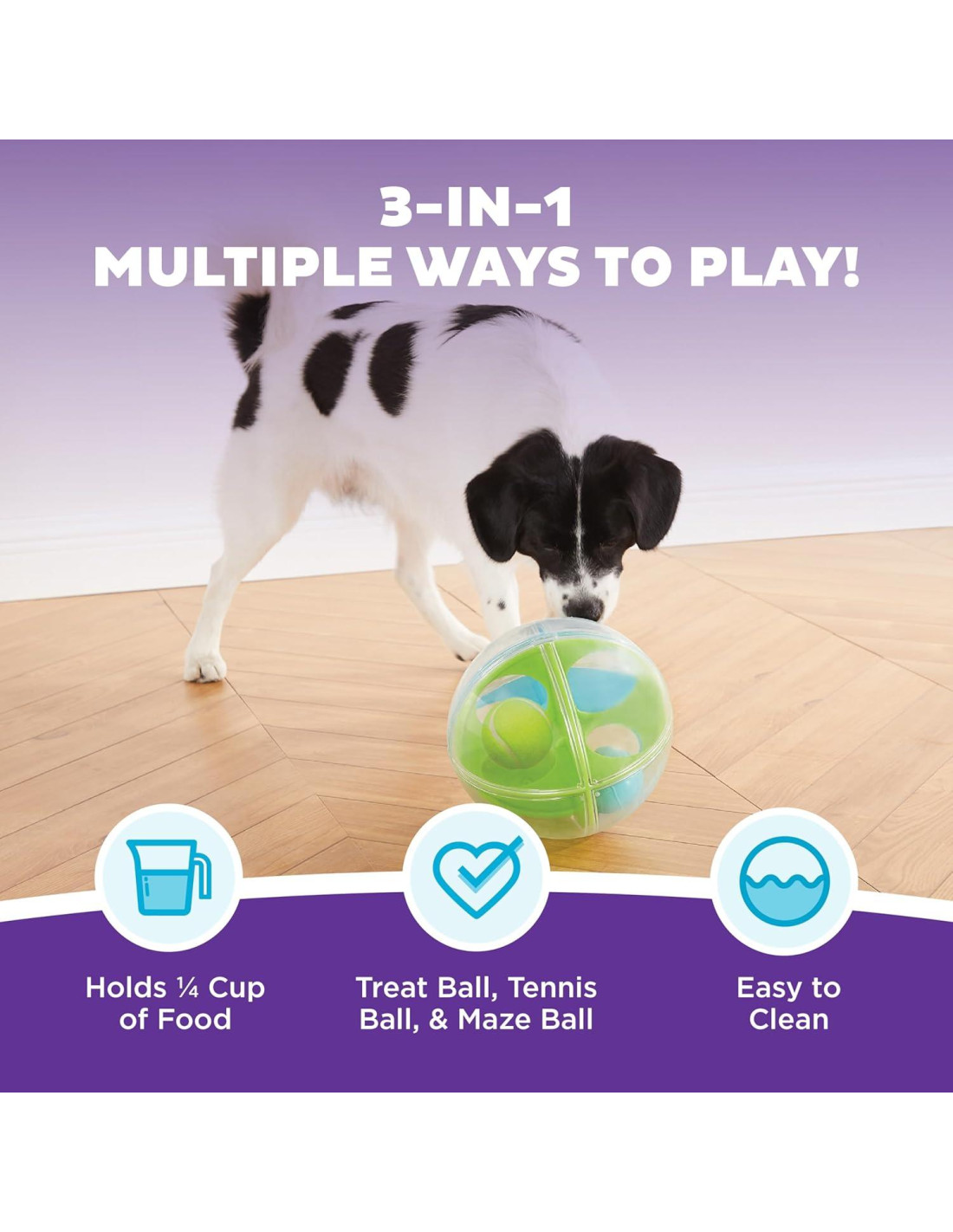 - Tres juguetes en uno - los perros hacen rodar la Bola A-Maze para liberar las bolas más pequeñas del interior, luego hacen rodar la bola de golosinas para liberar las golosinas; consulta nuestros Consejos y Trucos para formas de hacer el juego más fácil o más difícil para tu mascota