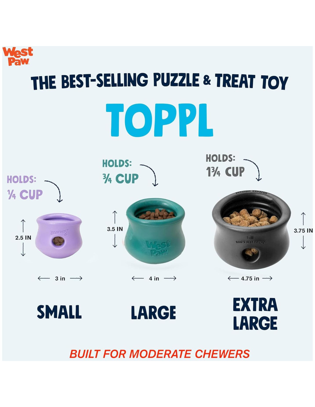 DISEÑADO PARA MASTICADORES MODERADOS. El juguete de rompecabezas y golosinas personalizable más vendido de West Paw acaba de ser agrandado para golosinas aún más grandes! Diseñado para ser llenado con el kibble o golosinas favoritas de un perro. Los 'dientes' internos suaves y redondeados de Toppl contienen una cavidad interna para mantener las golosinas en su lugar hasta que tu perro las empuje. Para cambiar el desafío, simplemente conecta el pequeño y el grande o el grande y el extragrande (se venden por separado) juntos para hacer que Toppl sea aún más resistente.