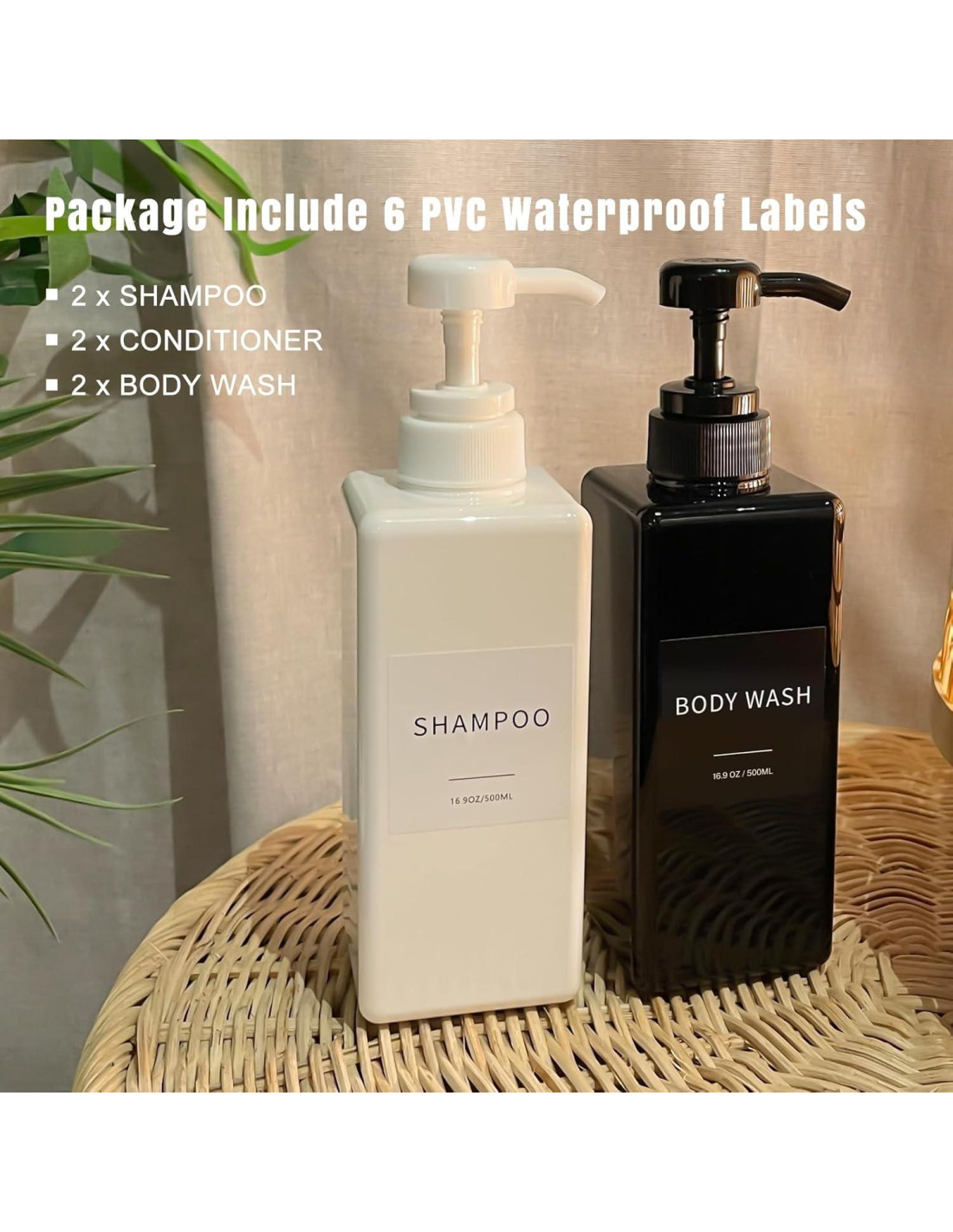 - Material Premium: Estos dispensadores de champú y acondicionador están hechos de plástico PETG extra grueso, resistente y duradero, no se rompen fácilmente y son cómodos de usar. Cada botella tiene una capacidad adecuada - 500 ml. También viene con 6 etiquetas en un estilo minimalista, que están hechas de material PVC, son impermeables y fáciles de limpiar.