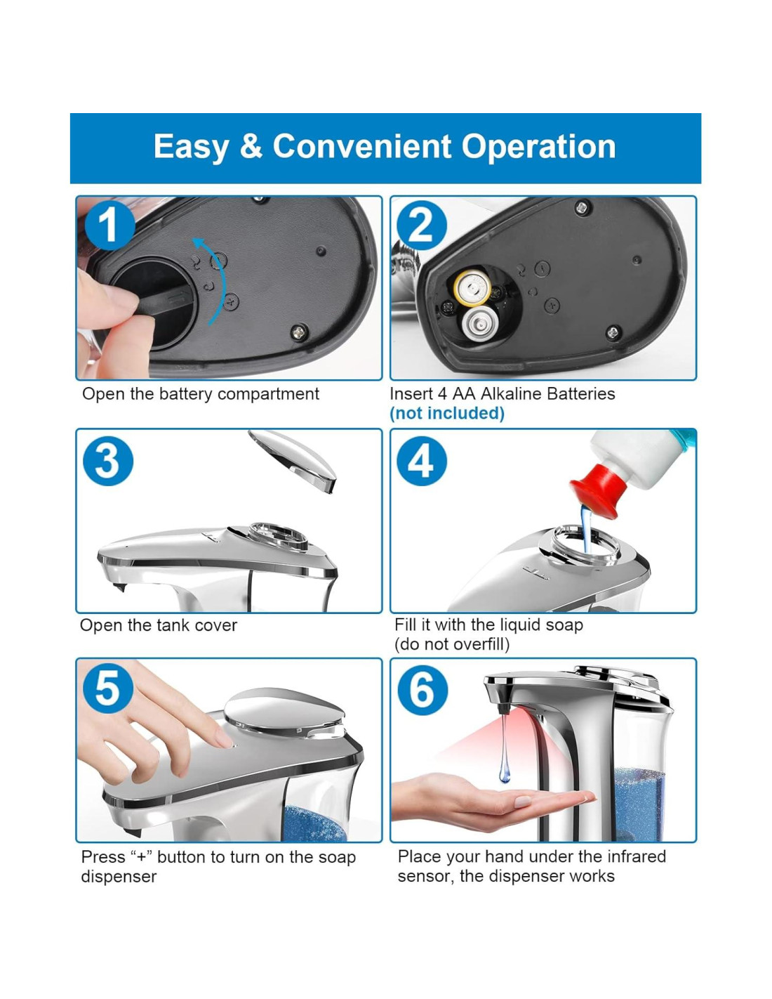 - [Dispensador de Jabón de Amplia Compatibilidad] Este dispensador de jabón sin contacto funciona con 4 baterías AA alcalinas (no incluidas), que se pueden usar en cualquier ocasión sin límites en el enchufe de alimentación. Adecuado para múltiples ocasiones, como hogar, hotel, escuela, oficina y otros lugares. Proporcionaremos 2 años de garantía de calidad y servicio profesional de por vida, por favor contáctanos si necesitas ayuda.