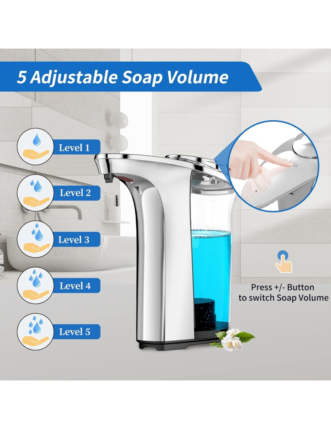 - 2) Dispensador Automático de 5 Niveles} Control de dispensación variable del volumen ajustando el interruptor "+/-". 5 configuraciones diferentes para ajustar la cantidad de jabón que deseas. Es un dispensador de jabón líquido ideal para lavar las manos y esponjas de lavar platos. Capacidad de 17.0oz (500ml).
