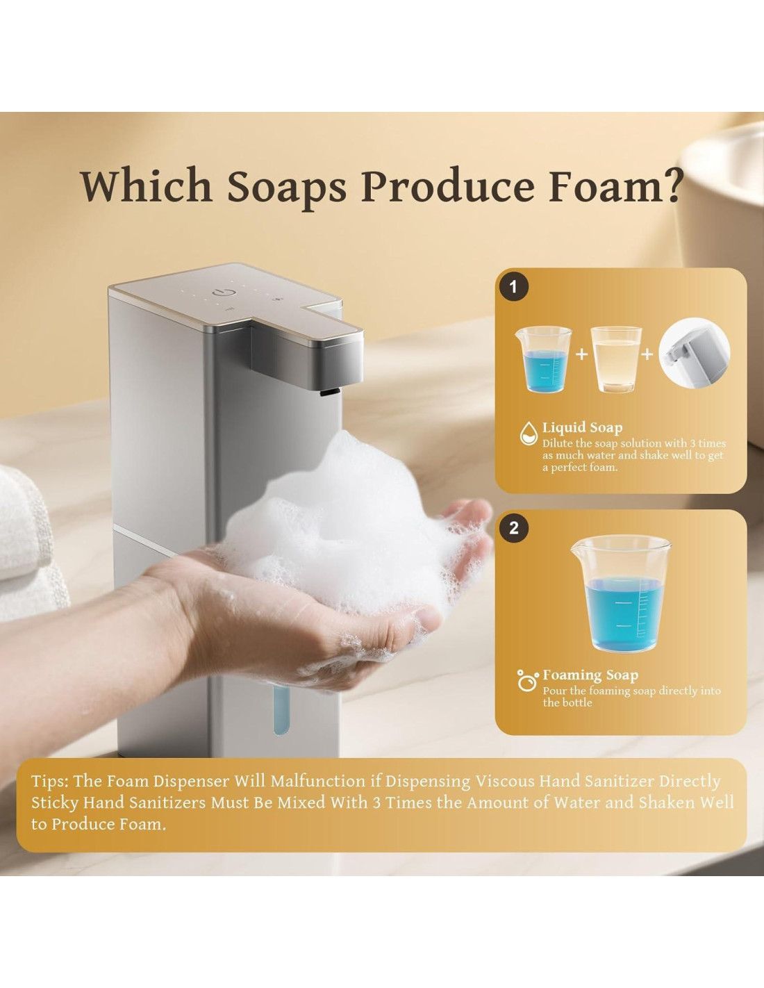 - Personalización Perfecta de Espuma: La detección de movimiento mejorada del dispensador de jabón espumoso sin contacto activa espuma densa en 0.25 segundos sin contacto físico. 4 modos preestablecidos permiten ajustes personalizados a través de controles de botón intuitivos, entregando la cantidad que te gusta. Consejos: El dispensador de jabón espumoso fallará si se dispensa jabón líquido viscoso directamente. El jabón líquido pegajoso debe mezclarse con 3 veces la cantidad de agua y agitarse bien para producir espuma.