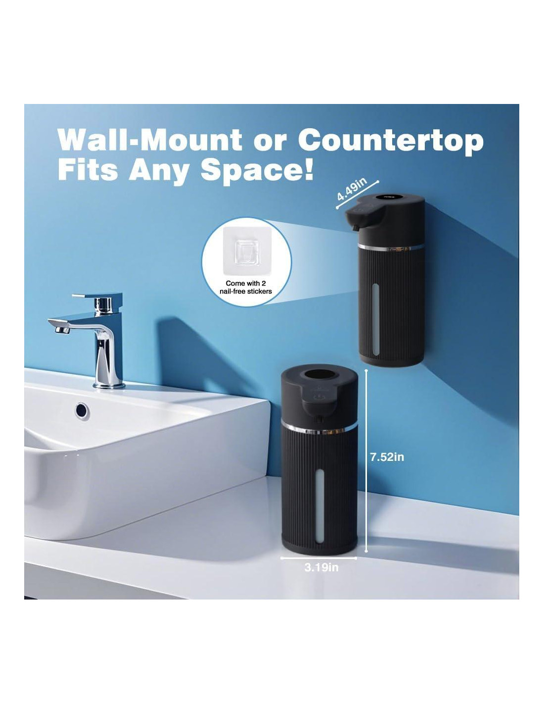 - [Montado en la Pared y de Encimera] El dispensador de jabón para baño se puede colocar en la encimera como un dispensador de jabón independiente. También se puede instalar en la pared sin perforar, viene con 2 pegatinas de pared sin rastro, las pegatinas tienen un fuerte agarre y alta pegajosidad, fácil de instalar y ahorrar espacio.