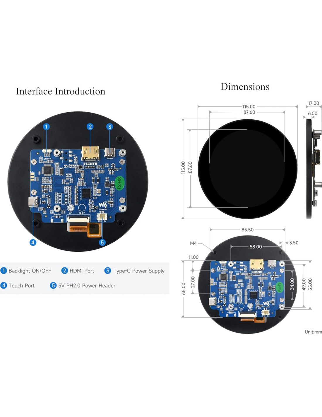 - Pantalla Táctil Redonda de 3.4 pulgadas, resolución de hardware 800x800. Interfaz de pantalla HDMI. Panel de pantalla IPS. Excelente rendimiento de visualización con un ángulo de visión amplio de 170