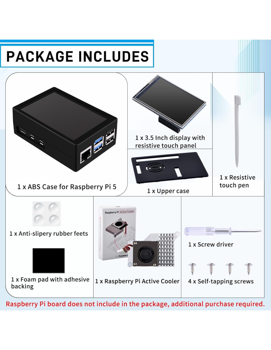 - El paquete incluye --- una caja de ABS, pantalla TFT LCD de 3.5 pulgadas y un enfriador activo Pi 5 para Raspberry Pi 5. NOTA: ¡Placa Raspberry Pi NO incluida!