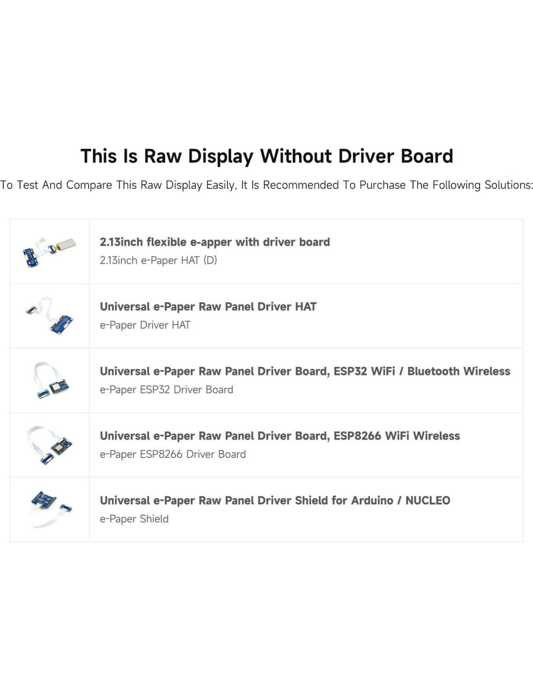 - Esta es una pantalla E-Ink flexible, de 2.13 pulgadas, 212x104 resolución, con controlador integrado, comunicándose a través de interfaz SPI, soporta actualización parcial.
