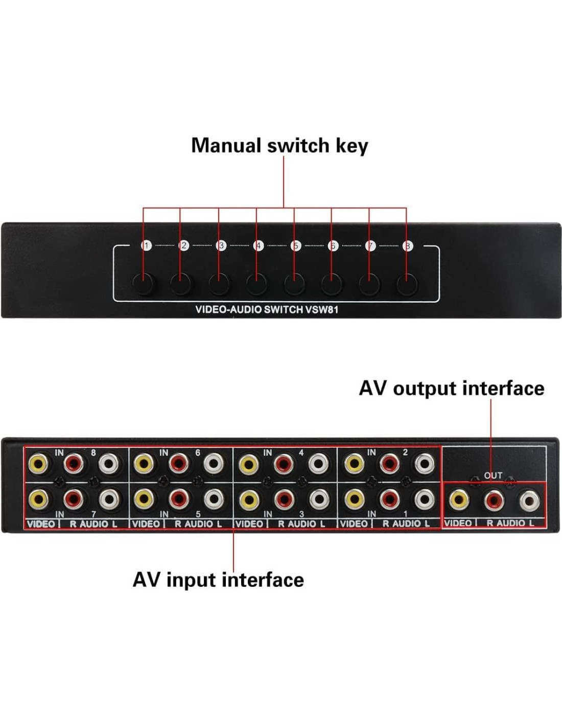 Especificación del Producto: Divisor Combinador de Audio Video de 8 Vías Conectividad: Caja de interruptor selector de audio/video compuesto de 8 en 1 (negro) que conecta hasta 8 dispositivos a tu televisor como XBOX, DVD, VCR, PS2 y Wii Conectores: 8 Entradas RCA de Video Compuesto y 8 de Audio Izquierdo/Derecho 1 Salida RCA de Video Compuesto y 1 de Audio Izquierdo/Derecho Características: Conecta hasta 8 dispositivos (reproductor de DVD, consola de juegos o VCR, caja de televisión) a tu televisor Tamaño compacto No se necesita alimentación externa Fácil de usar Interruptor selector de entrada Compatibilidad: Cualquier dispositivo que use cables de Audio RCA y Compuesto