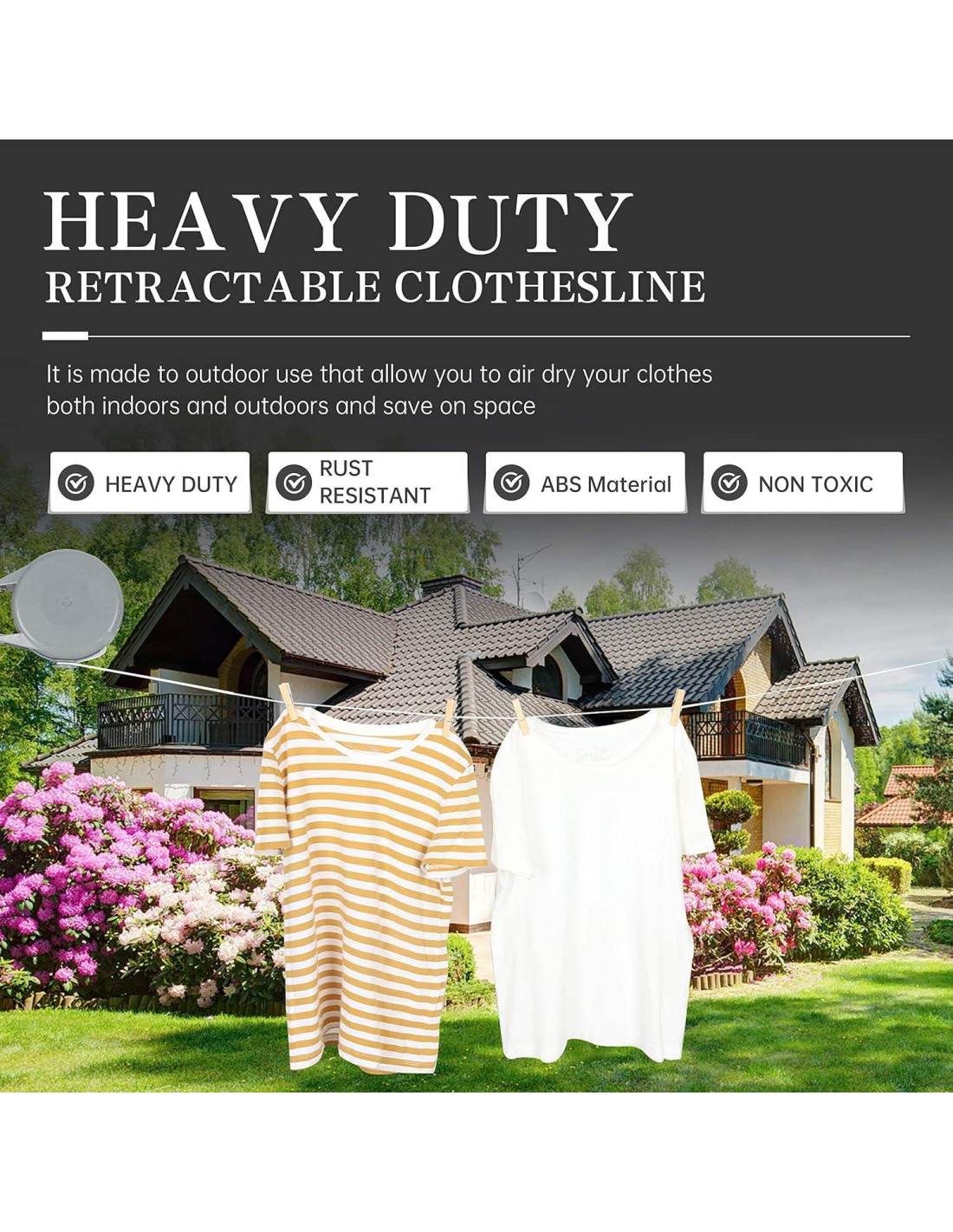 Fuerte. Compacta. Confiable. Simplifica tu rutina de lavandería con nuestra Cuerda Retráctil para Ropa - 15M (49 Pies), diseñada para uso tanto en interiores como exteriores. Ya sea que estés secando ropa en tu baño, balcón, jardín o área de lavandería, esta unidad compacta ofrece la fuerza y el espacio que necesitas sin ocupar espacio adicional. Diseño de Alta Resistencia Hecho con una línea de PVC duradera y una carcasa de ABS resistente, esta cuerda soporta el uso diario. El cordón retráctil de 15 metros se extiende suavemente y se bloquea a la longitud deseada, luego se retrae ordenadamente cuando no está en uso, ahorrando espacio y evitando el desorden. Instalación Rápida y Fácil Móntalo sin esfuerzo usando los tornillos y soportes incluidos. Instálalo en cualquier pared, dentro de tu hogar o al aire libre, en solo minutos. Bonificación Incluida: 12 Pinzas de Madera ¡Comienza de inmediato! Tu cuerda incluye 12 pinzas de madera ecológicas, dándote todo lo que necesitas desde el principio. Versatilidad Interior y Exterior Resistente a la intemperie y compacta, es perfecta para baños, balcones, patios, jardines, lavanderías e incluso para viajar o acampar.
