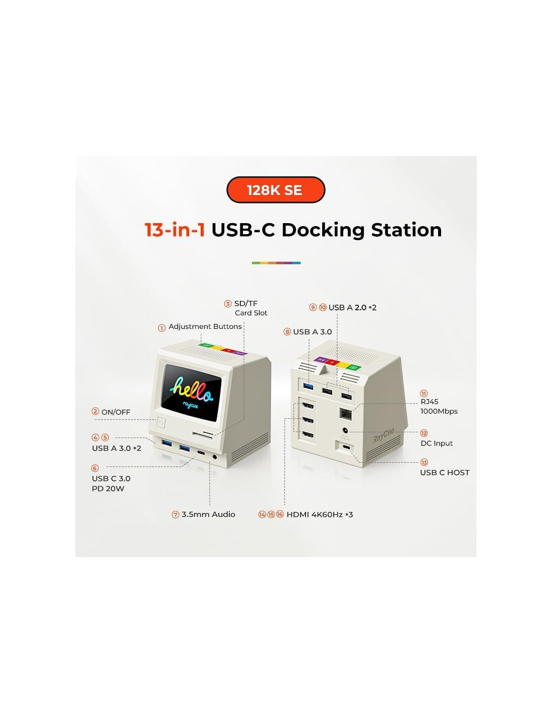 - Empodera tu configuración con 13 puertos poderosos Raycue 128K SE estación de acoplamiento triple monitor con adaptador de poder de 45W te proporciona hasta 13 opciones de conectividad que van desde 3 puertos HDMI 4K, 1 puerto USB-C 5 Gbps, 5 puertos USB-A, 1 puerto Ethernet 1 Gbps, ranura SD/micro SD, y un puerto de audio para todas tus necesidades periféricas. Nota: La estación de acoplamiento Raycue128K SE debe conectar el adaptador de poder de 45W, de lo contrario no funcionará.