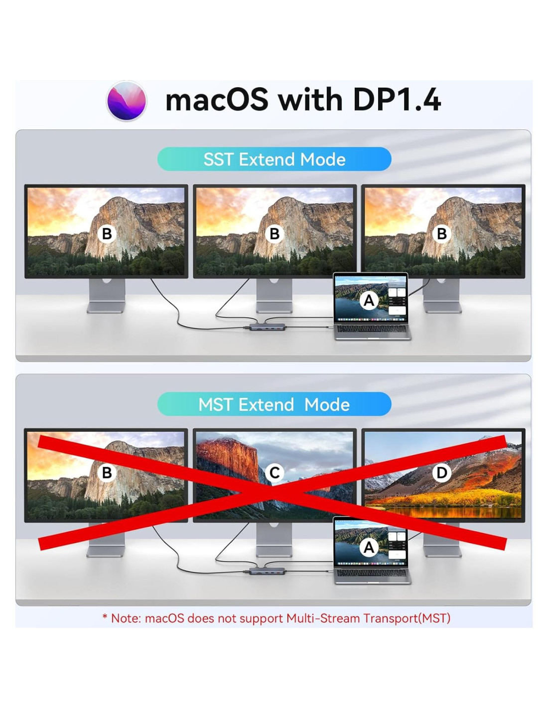 - [Estación de Acoplamiento de Triple Pantalla 4K] El uso único de HDMI puede alcanzar hasta 4K @60 Hz bajo fuente DP1.4. La resolución DP1.4 será 4K@60Hz si 3 monitores se reproducen simultáneamente. Cuenta con puertos HDMI triples, permitiendo que tres monitores externos funcionen simultáneamente. Puedes conectarte a HDMI 1&HDMI 2&HDMI 3, para un total de 4 contenidos diferentes entre tu laptop y cada monitor (contenidos: A-BCD). Ten en cuenta: macOS solo admite modo espejo, lo que significa que todos los monitores conectados mostrarán el mismo contenido (contenidos: A-BBB).