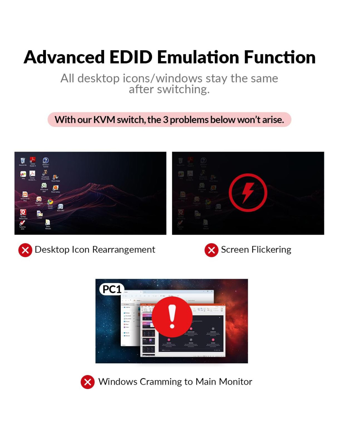 - Cambio Súper Rápido: Con la función automática de activación de PC y simulación EDID, solo te toma 2-3 segundos cambiar entre tus fuentes de PC. Solo presiona el botón de control frontal para cambiar sin esfuerzo.