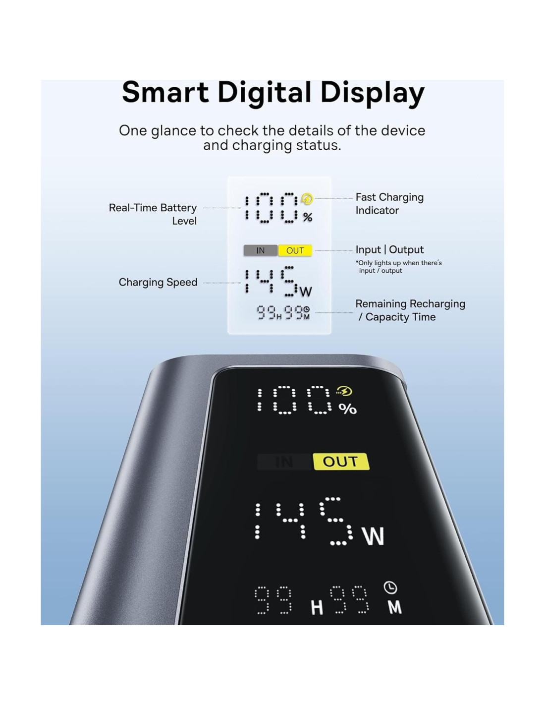 - Monitoreo del Estado de la Batería: La pantalla digital inteligente en esta batería portátil te permite verificar el nivel de batería en tiempo real, la velocidad de carga y el tiempo restante que la batería puede durar o cuánto tiempo tarda en alcanzar el 100% de un vistazo. Mantén un ojo en la carga y sabe cuándo tus dispositivos estarán listos.