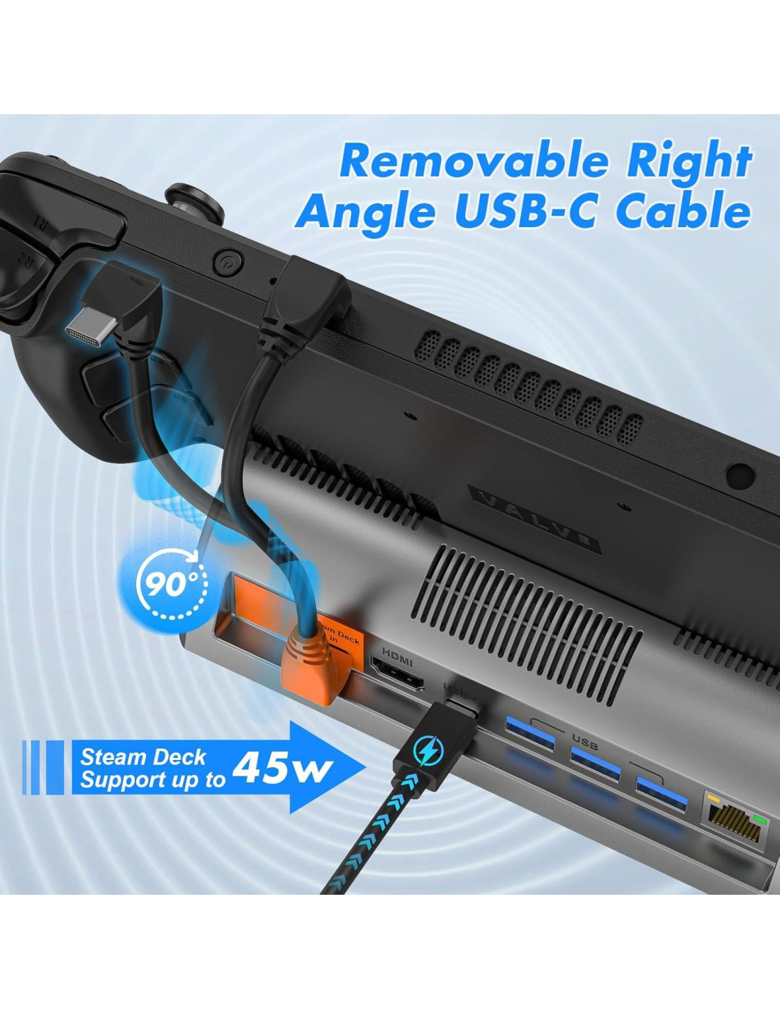 - Fácil de usar, conecta la base de Steam Deck a la TV/proyector con el cable HDMI 2.1 que soporta salida 4K@120Hz. Conecta el adaptador de corriente original de Steam Deck al puerto USB-C de la estación de acoplamiento para usarla, la estación de acoplamiento Steam Deck soporta una salida de potencia máxima de 100W, puede cargar el Steam Deck mientras juegas con la pantalla de la TV. Cuando se empareja con el cargador original, esto es suficiente para cargar tu Steam Deck a toda velocidad. (Nota: El Steam Deck tiene una tasa de carga máxima de 45W)