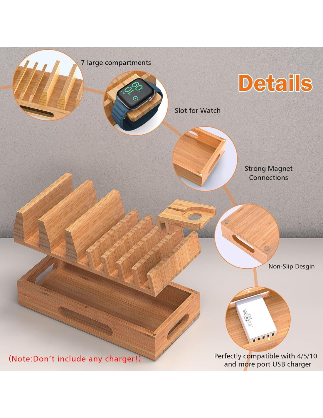 - BAMBÚ ORGÁNICO SOSTENIBLE PREMIUM: Nuestra estación de carga está hecha de bambú renovable. Más duradera que las estaciones de carga de plástico, sin preocupaciones por el agrietamiento de los separadores de plástico, mantiene tu tableta y teléfono inteligente de manera estable. Un soporte para todos los dispositivos: eliminador de cables enredados, nuestro soporte de carga de bambú mantiene tu escritorio ordenado y limpio. No más desorden