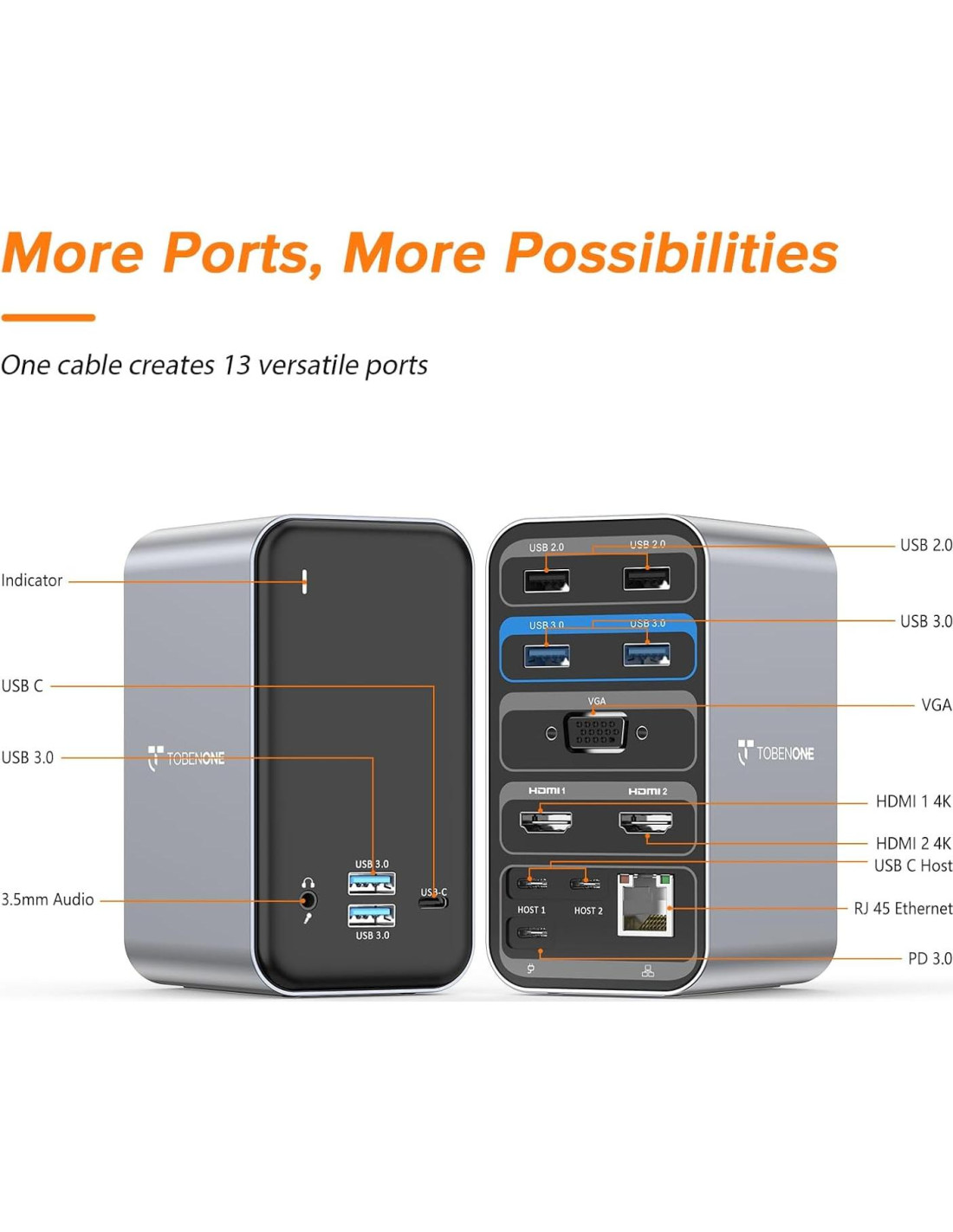 - Estación de Acoplamiento USB C de 13 en 2: Esta estación de acoplamiento USB C de doble monitor para MacBook Pro combina perfectamente todas las funciones que necesitas. Está equipada con 2 HDMI 4K, 1x VGA, 4 x USB 3.0 y 1 x USB C (hasta 5Gbps), 2 x USB 2.0 (para dispositivos inalámbricos), puerto USB C PD 3.0 (soporta salida máxima de 85w), Audio/Mic de 3.5 mm, Ethernet Gigabit y puerto HOST dual (conectar al MacBook y al dock). Solo usa un cable USB C con dos salidas en cada extremo para conectar todos tus dispositivos y satisfacer tus necesidades en la vida diaria