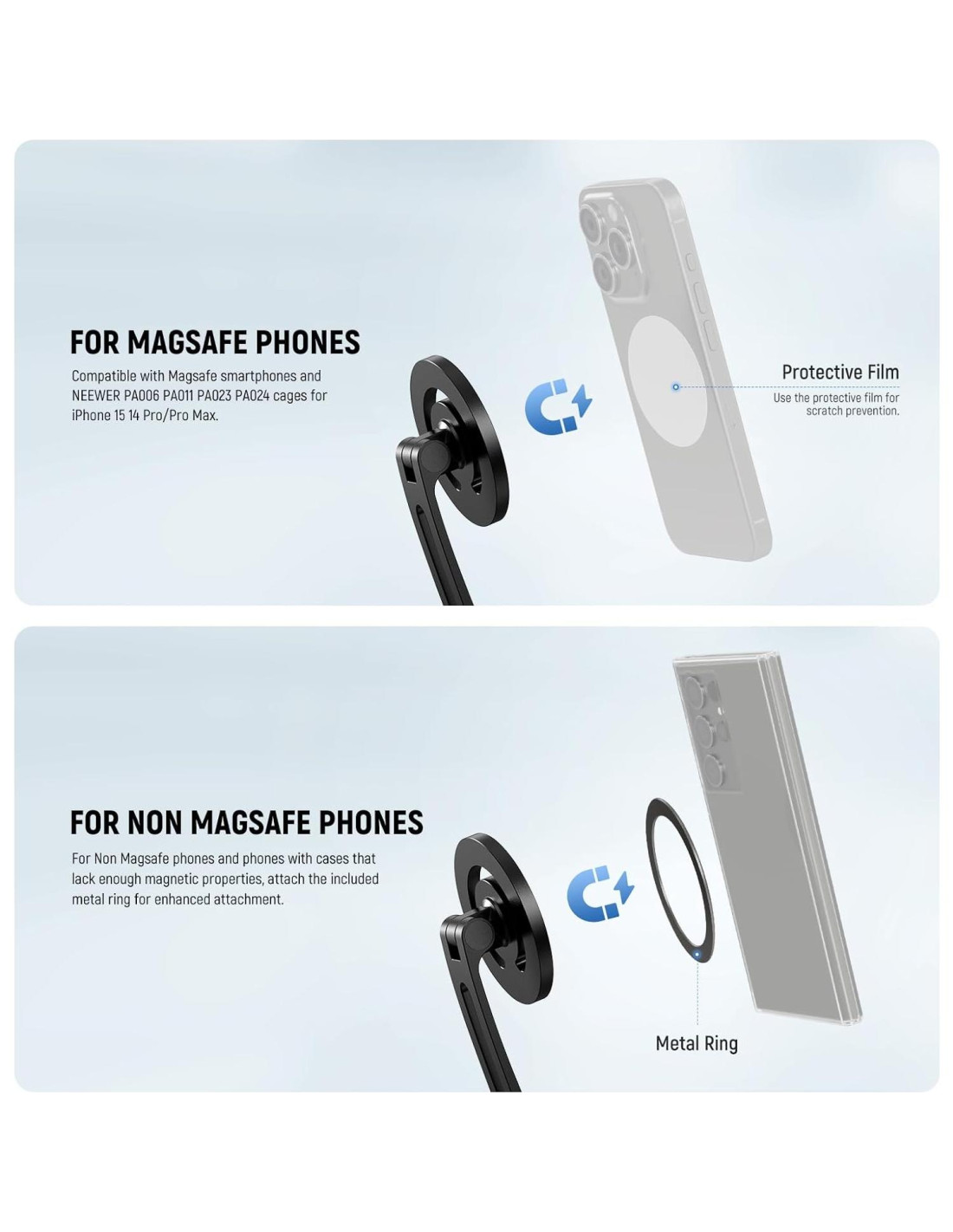 - Grabación de Teléfono Manos Libres El soporte magnético para el cuerpo del cuello para teléfonos, como un collar, viene con un soporte para teléfono flexible compatible con la funda MagSafe iPhone 16 15 Pro Max Plus 14 13 para creadores de contenido, vlogging, filmación, grabación de video y otras creaciones. Para teléfonos con propiedades magnéticas insuficientes, se incluyen 2 anillos magnéticos para ser adjuntados a una funda de teléfono para ampliar la compatibilidad, haciendo que el GP16 sea adecuado para casi todos los teléfonos inteligentes.