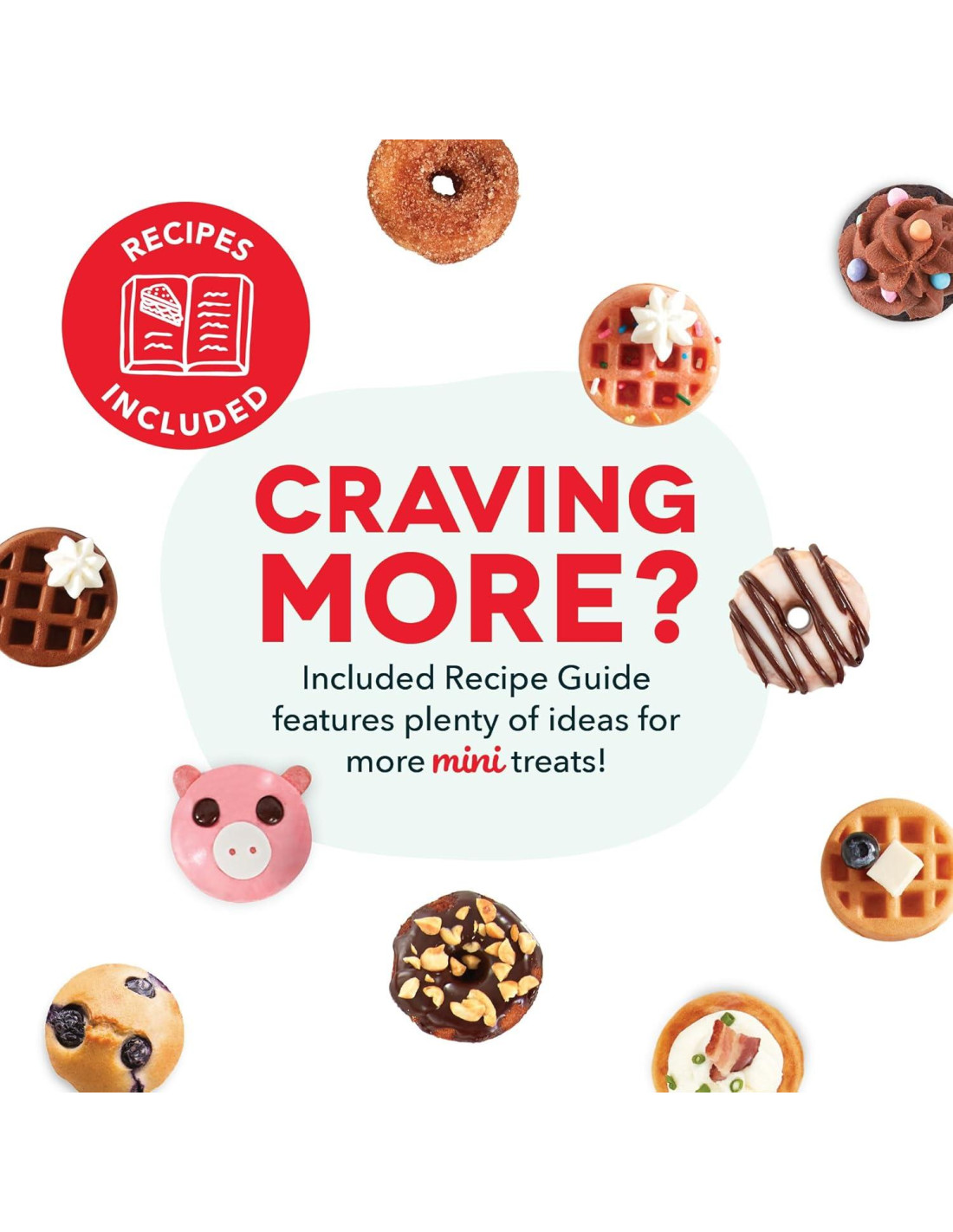 - DELICIAS EN MINUTOS: Un Sistema de Delicias cocina 7 mini donas, 9 mini pasteles, y 7 mini bocados de waffle. ¡No se requiere configuración! Simplemente coloca las placas, enchufa y comienza a cocinar!