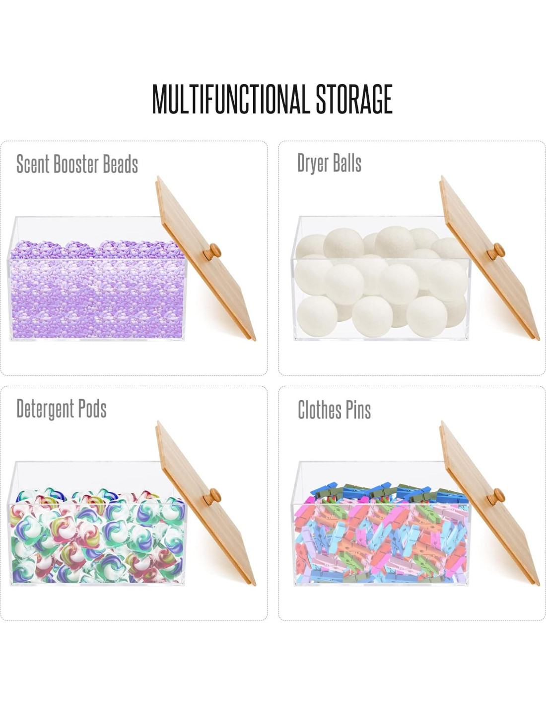 - Organización y Almacenamiento de LavanderíaHemos incluido etiquetas de "hoja de secadora" que puedes elegir mantener o no. Esto permite que nuestras cajas se utilicen como un almacenamiento versátil para una variedad de esenciales de lavandería, incluyendo cápsulas de detergente, perlas de aumentador de fragancia, pelotas de secado, pinzas para ropa, etc.
