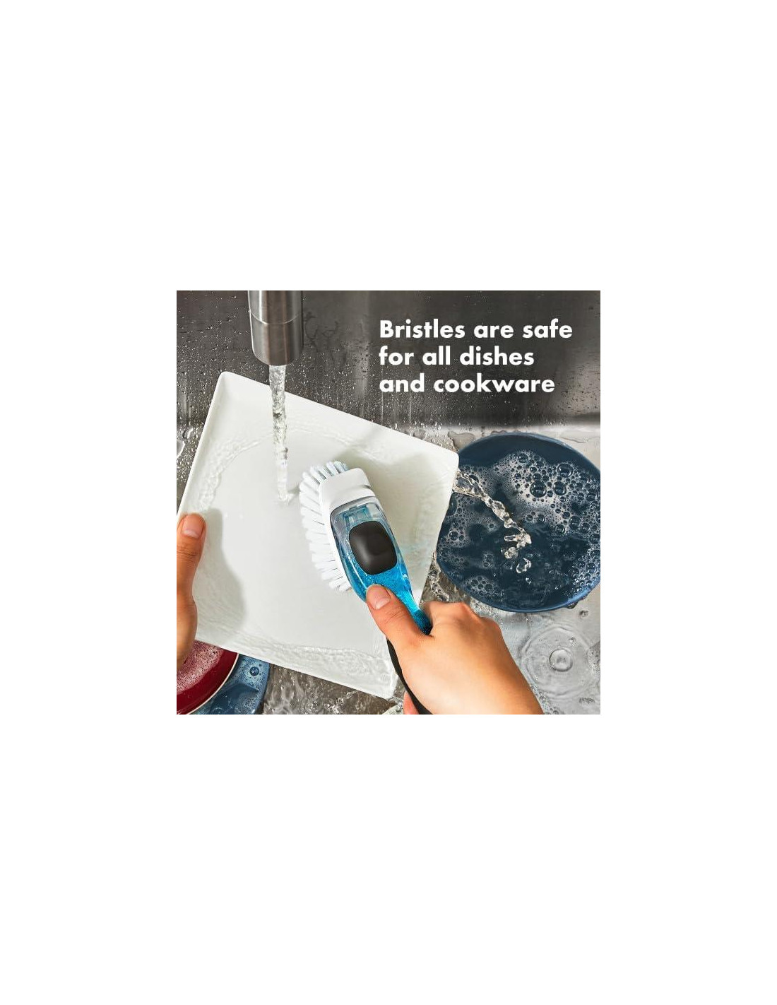 Con un ligero empuje del botón suave y antideslizante, la válvula de silicona dispara jabón sobre tus platos, luego se sella rápidamente para evitar goteos y desperdicios. Incluye un raspador en la parte posterior para eliminar alimentos pegados. Las cerdas de nylon duraderas son seguras para utensilios de cocina y bandejas antiadherentes.