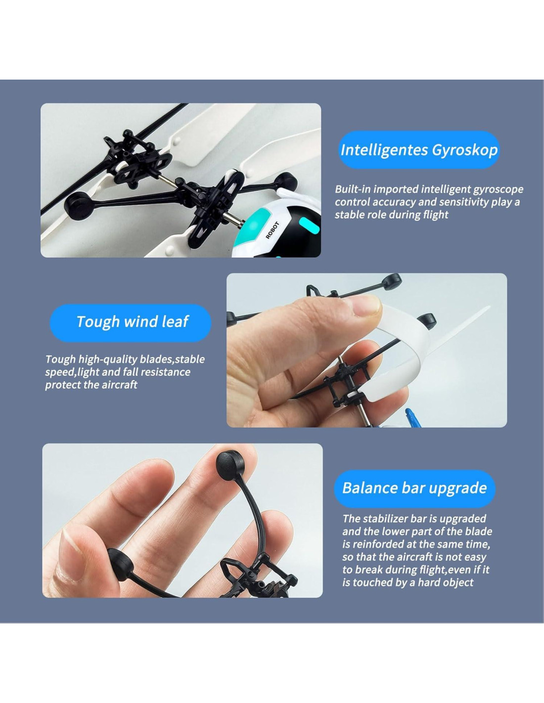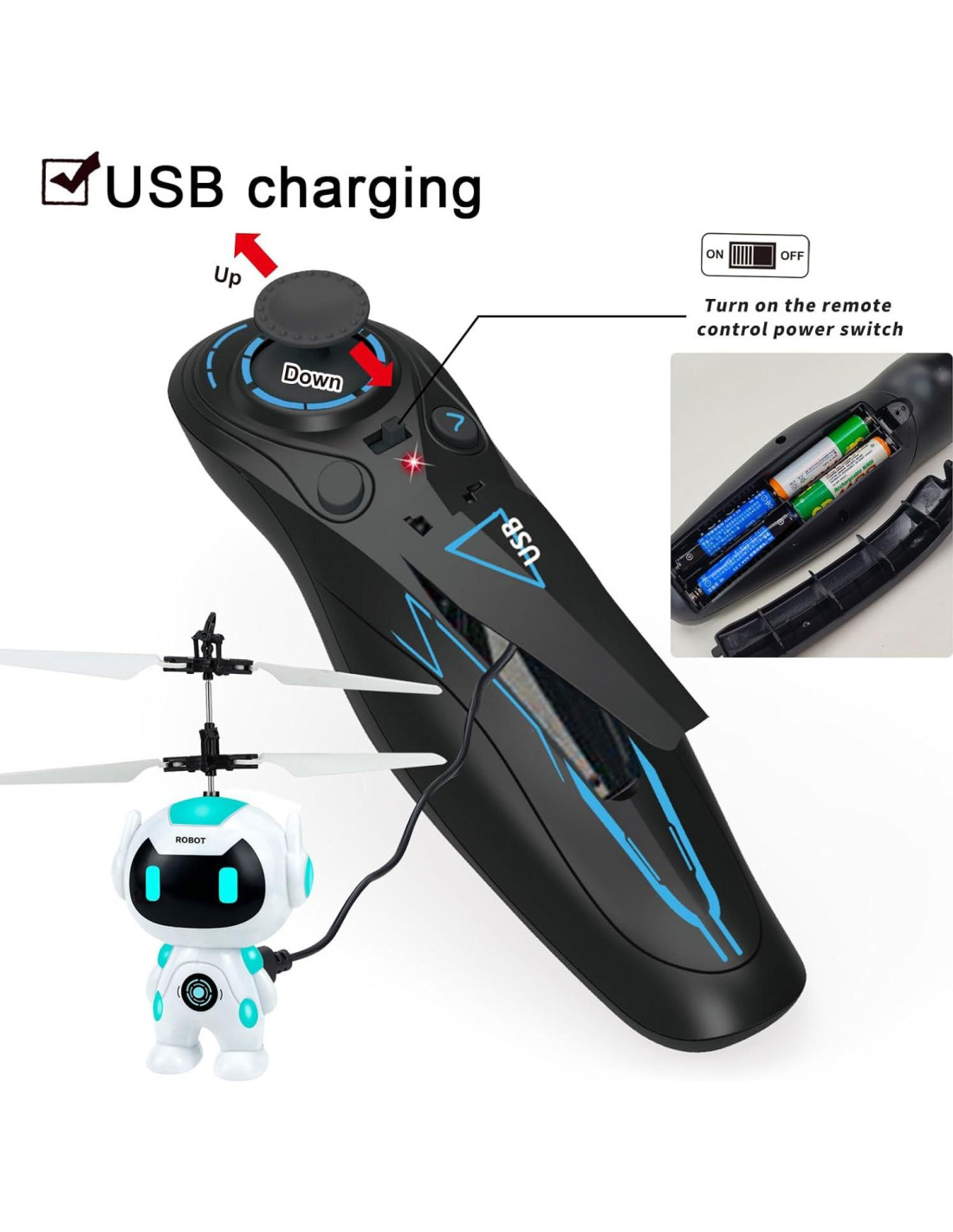 - Cómo Jugar con el Juguete Volador Rc: Enciende el interruptor, el juguete robot volador comenzará a volar automáticamente en 2 o 3 segundos. El niño solo necesita soltar la mano y dejar que el robot volador se eleve, cuando el robot vuele alto, puede controlar el robot volador operando el control remoto para hacerlo volar bien. Es realmente un juguete robot mágico y vuela verdaderamente en el cielo. Todos los niños mayores e incluso los adultos se divertirán con el mini helicóptero de control remoto