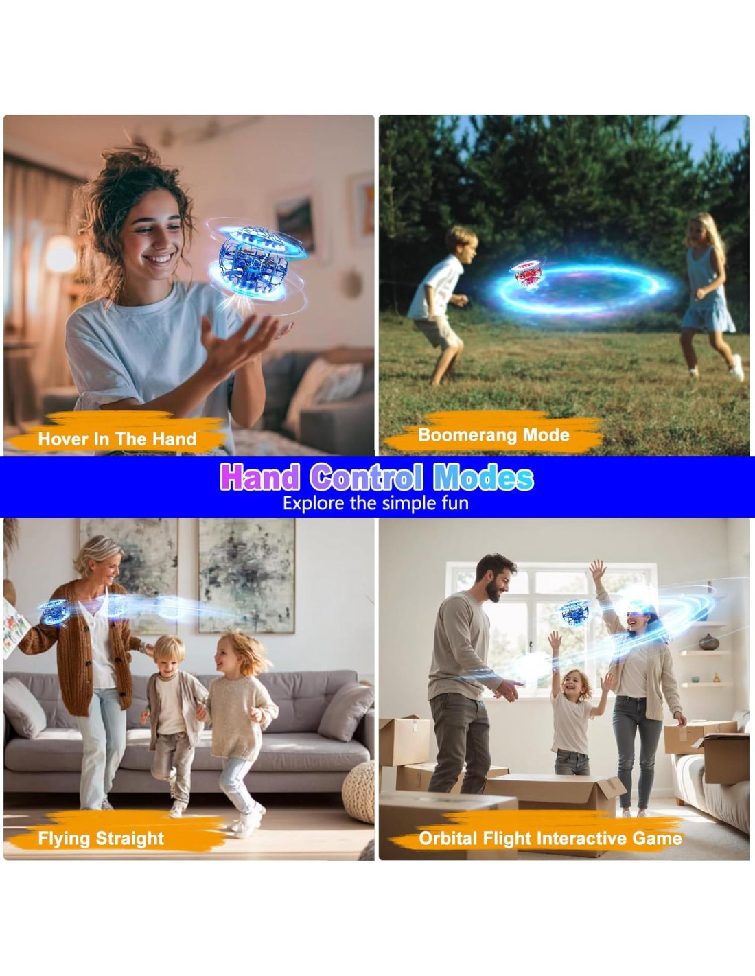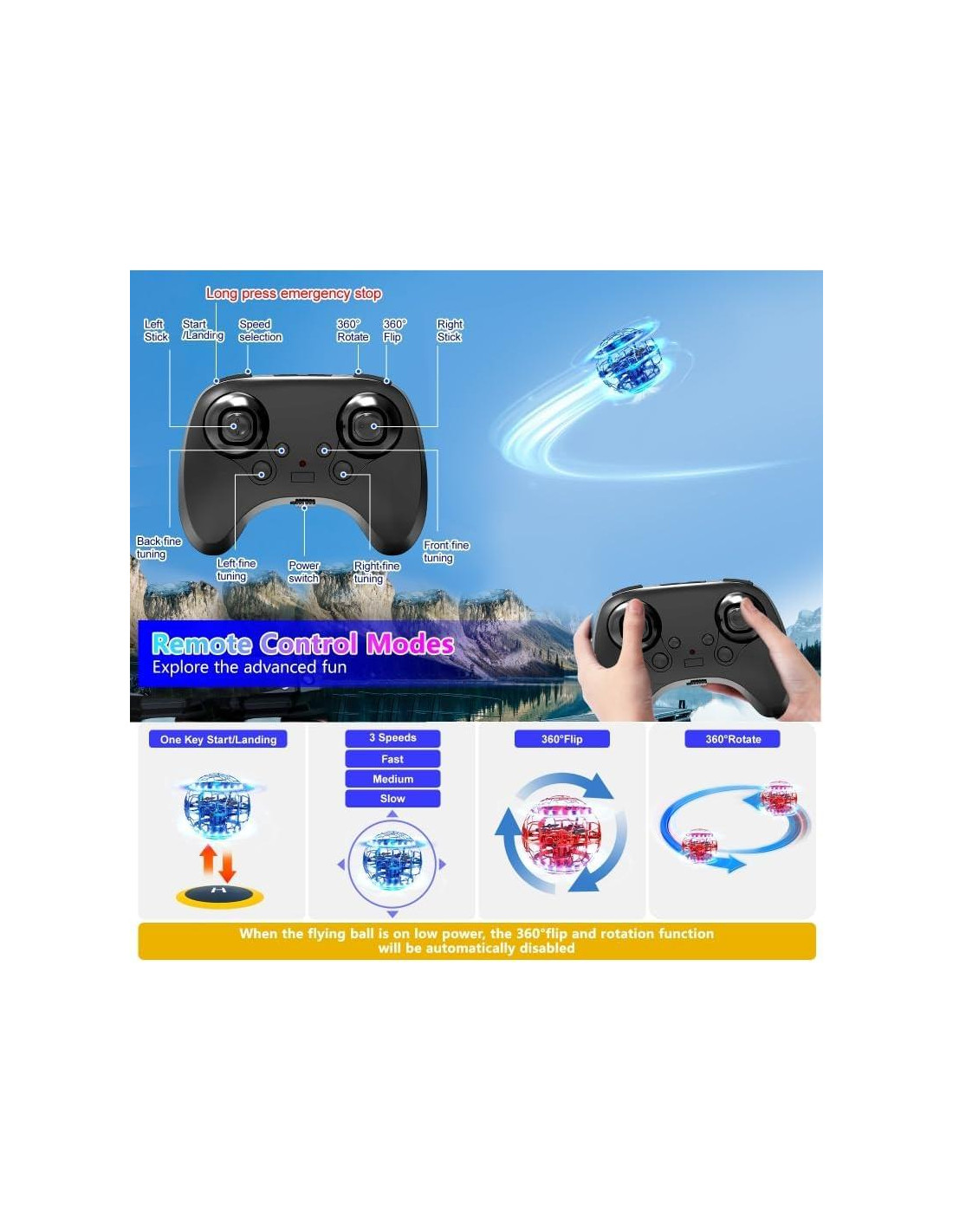- MODOS DE VUELO CONTROLADOS A MANO Y CONTROL REMOTO: ¡Controla las bolas flotantes definitivas con estabilidad de 4 ejes! Nuestra bola voladora pro mantiene la altitud perfecta para maravillas flotantes en la palma de la mano y aventuras de vuelo de dron de bola a alta velocidad. En modo manual, puedes experimentar funciones como flotación, juego interactivo de vuelo orbital, una bola boomerang para múltiples personas, etc. En modo de control remoto, desbloquearás más funciones: inicio y parada con un botón, rotación y volteretas de 360, y ajuste de velocidad.