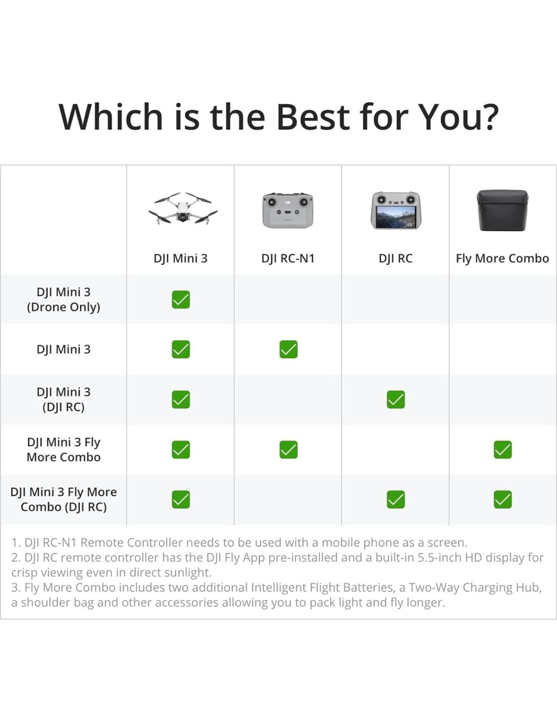 - Con dos baterías de vuelo inteligentes adicionales, un hub de carga bidireccional y una bolsa de hombro, estás listo para aventuras extendidas. Este combo incluye el nuevo DJI RC, que tiene la App DJI Fly preinstalada y una pantalla HD de 5.5 pulgadas.