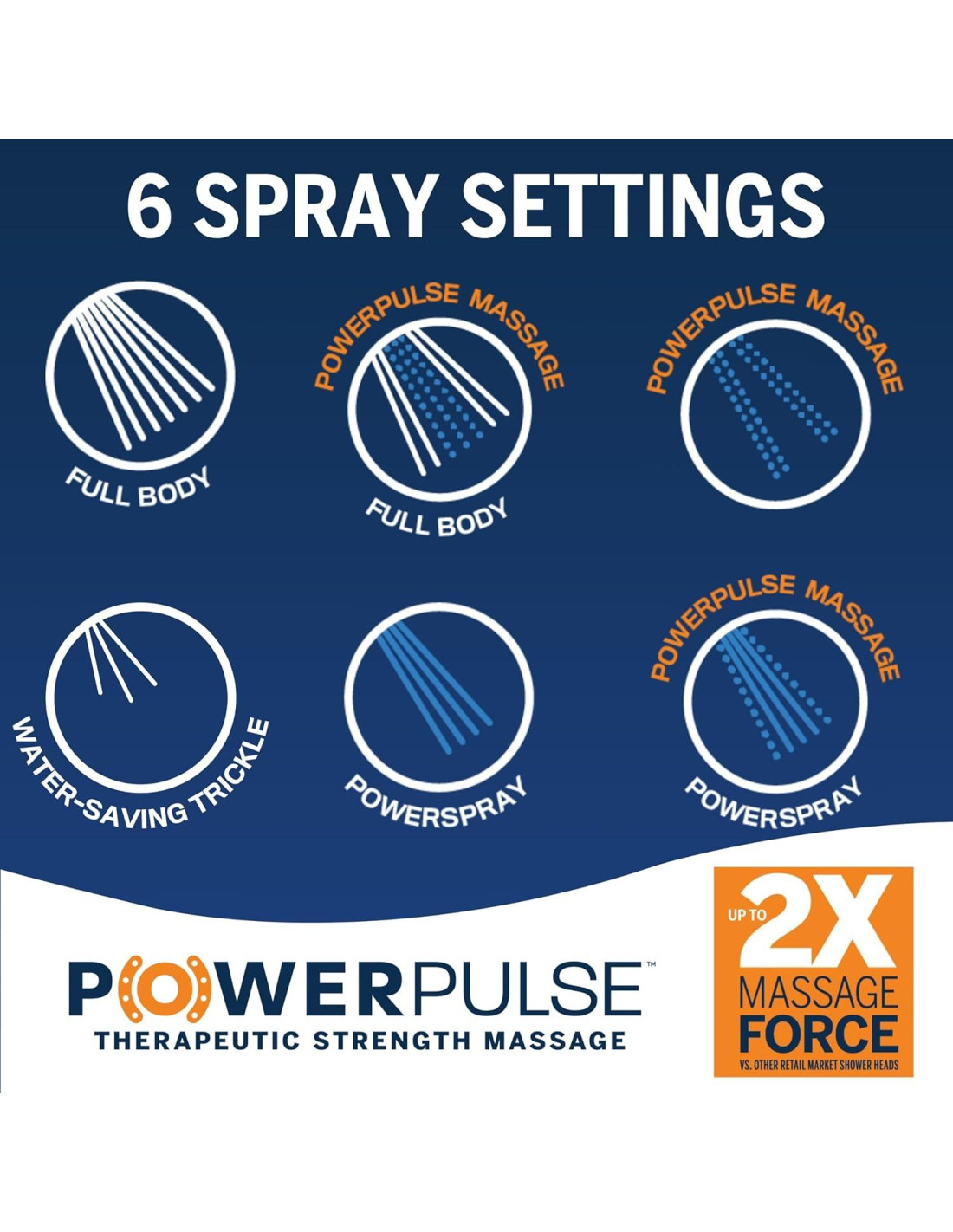 - CABEZAL DE DUCHA DE MASAJE POWERPULSE: Rejuvenece con este cabezal de ducha de 6 modos en cromo que presenta nuestro rociado de masaje terapéutico de fuerza PowerPulse patentado que entrega hasta 2X la fuerza de masaje