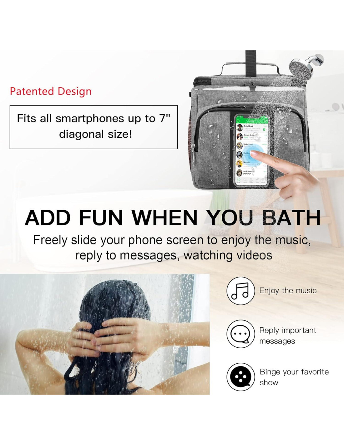 - [2 EN 1 BOLSILLO FRONTAL] El bolsillo frontal de la bolsa de ducha no es solo para almacenamiento de pequeños artículos, también está diseñado para ser un soporte para teléfono. Puedes deslizar libremente la pantalla de tu teléfono para ver y controlar las pantallas a través de la capa impermeable, escuchar música, enviar correos electrónicos y tweets, ver videos. Ahora no te preocupes por perder una llamada importante o mensaje de texto.