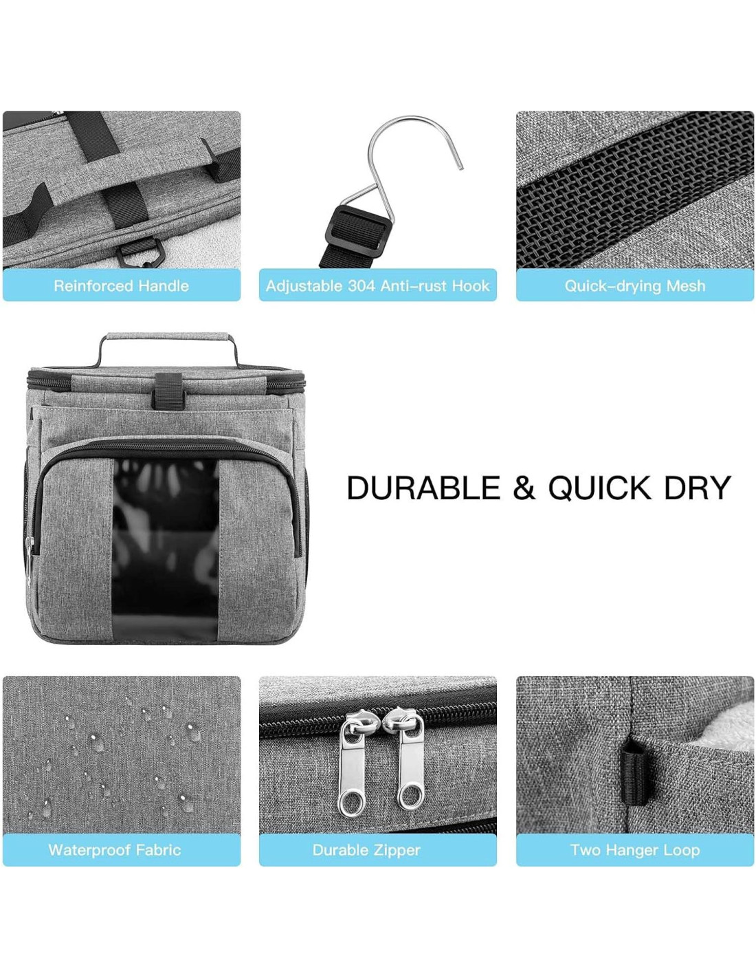 - [GRANDE Y ORGANIZADO] El tamaño de los compartimentos de apertura: 22.86 cm L x 21.59 cm H x 7.62 cm W, compartimento sellado: 25.4 cm L x 24.38 cm H x 12.7 cm W, Peso: 380.45 g (ligera). Construido con 2 grandes compartimentos, 3 bandas elásticas grandes, 3 bandas elásticas medianas, 2 bandas elásticas pequeñas, 2 bolsillos de malla internos, 2 grandes bolsillos de malla laterales, 1 bolsillo con cremallera frontal con bolsillo especial para teléfono, 1 bolsillo con cremallera trasera. ¡Puedes poner todas tus cosas! como champú de tamaño completo, gel de baño, crema, peine, maquillaje, teléfonos, llaves, etc.