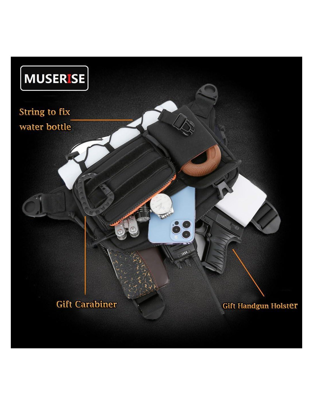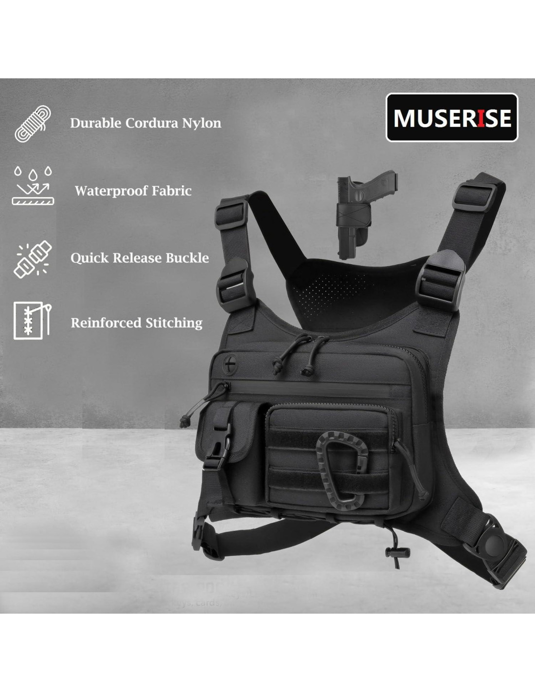 - Múltiples Compartimentos y Regalo de Funda: Nuestra bolsa de pecho cuenta con varios compartimentos para tus esenciales. Almacena todo, desde tu billetera y llaves hasta tu teléfono móvil y equipos EDC, todo al alcance de la mano. También proporcionamos una funda como regalo que puede asegurar tu pistola dentro de la bolsa.