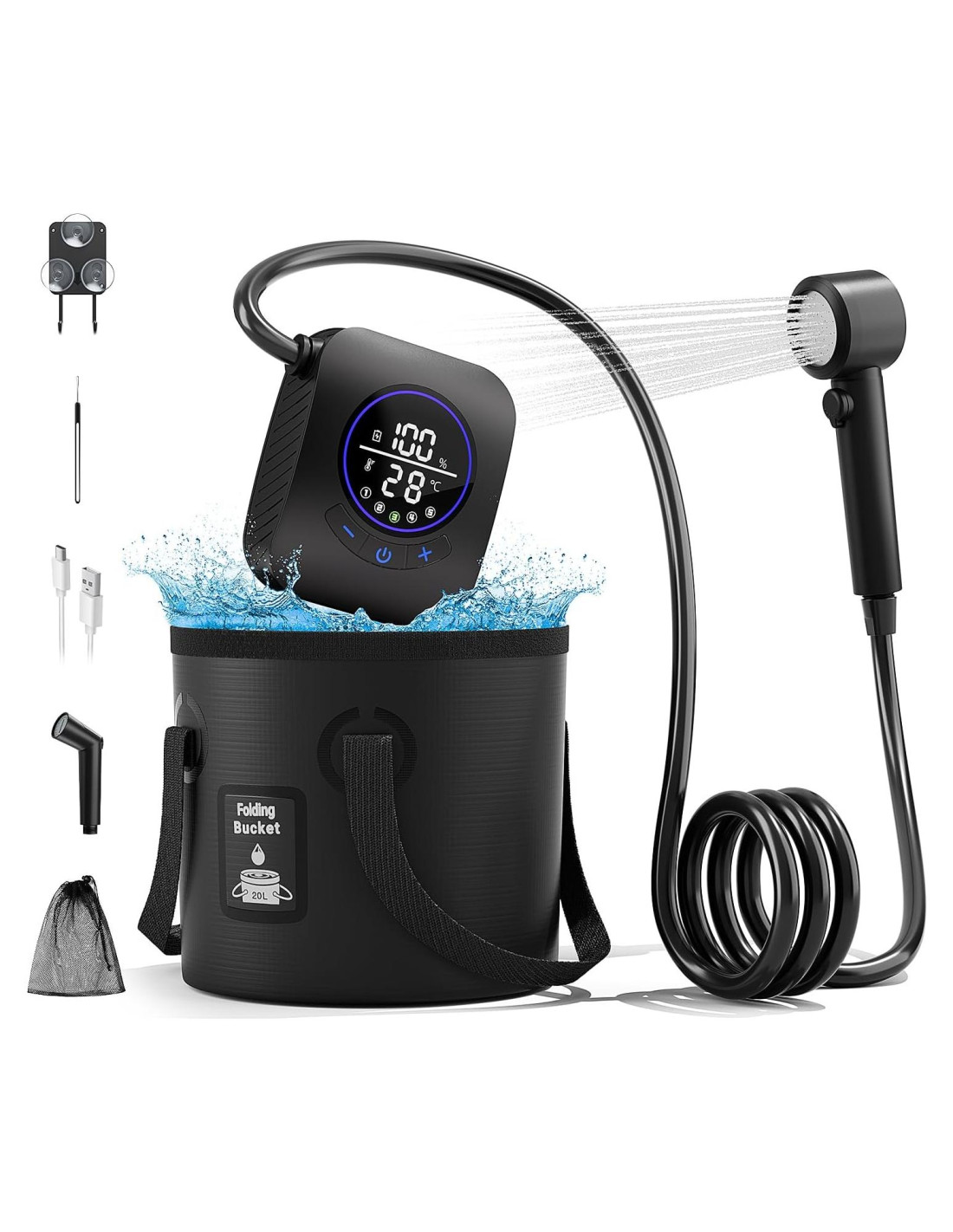 - Componentes incluidos: Tubo de agua, bomba de agua, cable de carga Type-C, cabeza de pistola de spray, bolsa de malla, cabeza de ducha, gancho 3 en 1, cubo de 5 galones
