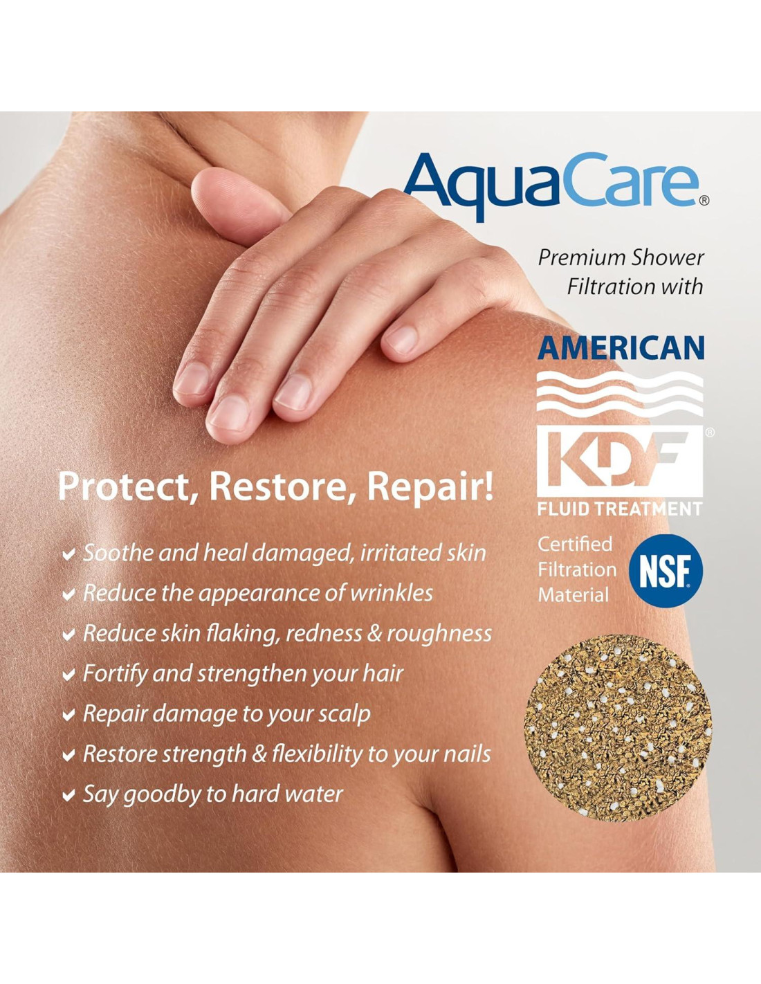 - FILTRO DE DUCHA KDF PREMIUM INCORPORADO - Comienza a disfrutar de una piel, cabello y uñas más saludables y de aspecto más joven con AquaCare. A diferencia de otros filtros de ducha que reemplazan el costoso KDF con una mezcla engañosa de pellets baratos e ineficaces, nuestro cartucho de filtro está cargado con KDF enriquecido de primera calidad. Es el material más efectivo para eliminar cloro, metales pesados, toxinas y bacterias del agua de la ducha, haciéndola tan pura que puedes beberla. Y nuestros cartuchos de reemplazo de bajo costo siempre se pueden encontrar en Amazon.