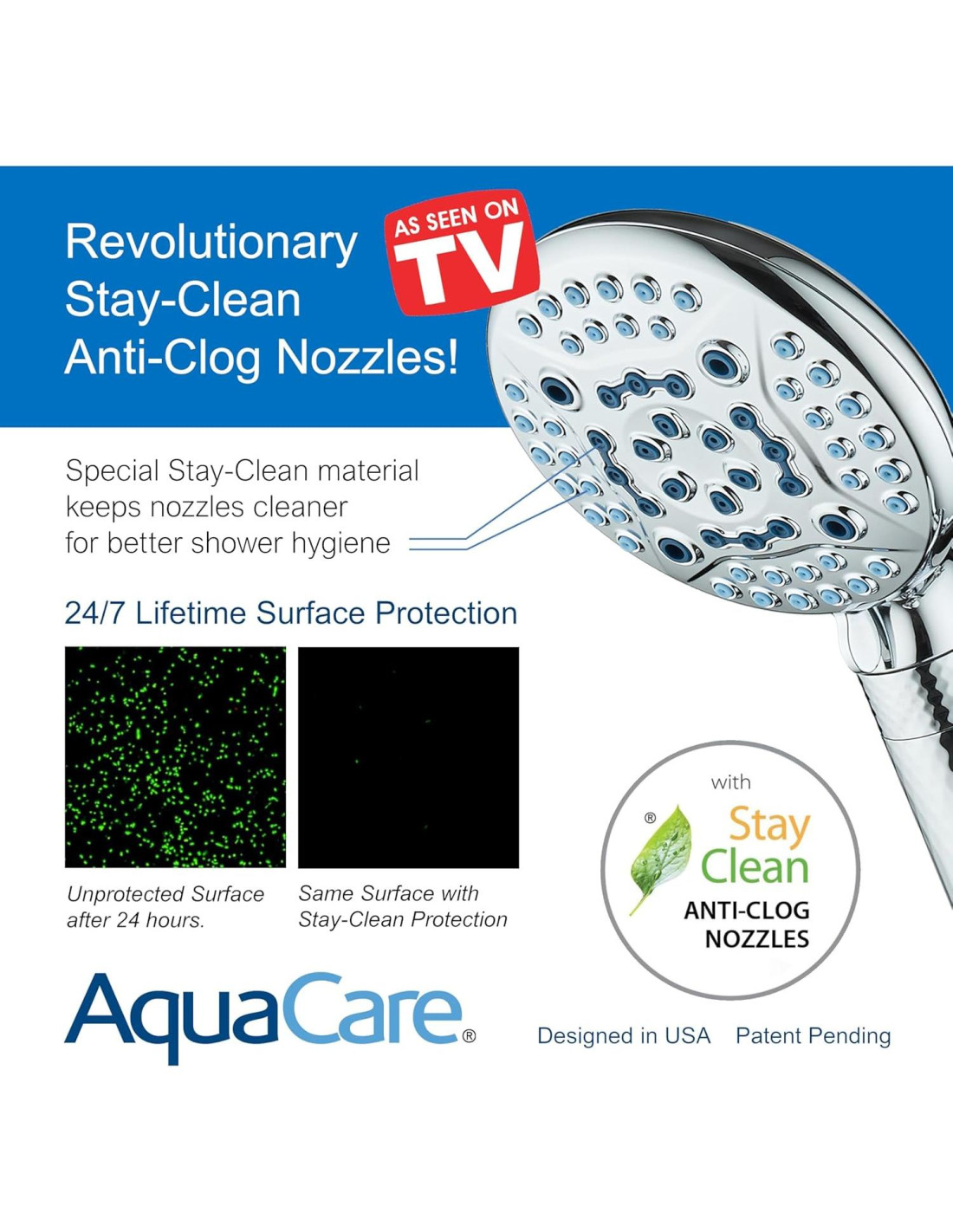 - PROTECCIÓN PURA Y LIMPIA DE POR VIDA - Los estudios muestran que los cabezales de ducha ordinarios a menudo están infestados de suciedad que crece rápidamente durante la noche, y luego se expulsa en tu cara con la ducha de la mañana. Por eso es esencial mantener limpio tu cabezal de ducha para una buena higiene en la ducha. Las boquillas AquaCare están hechas con un material revolucionario de Mantenimiento Limpio que trabaja 24/7 a nivel molecular para prevenir su contaminación. Esta protección es 100% segura y efectiva durante la vida del producto y nunca puede desgastarse.