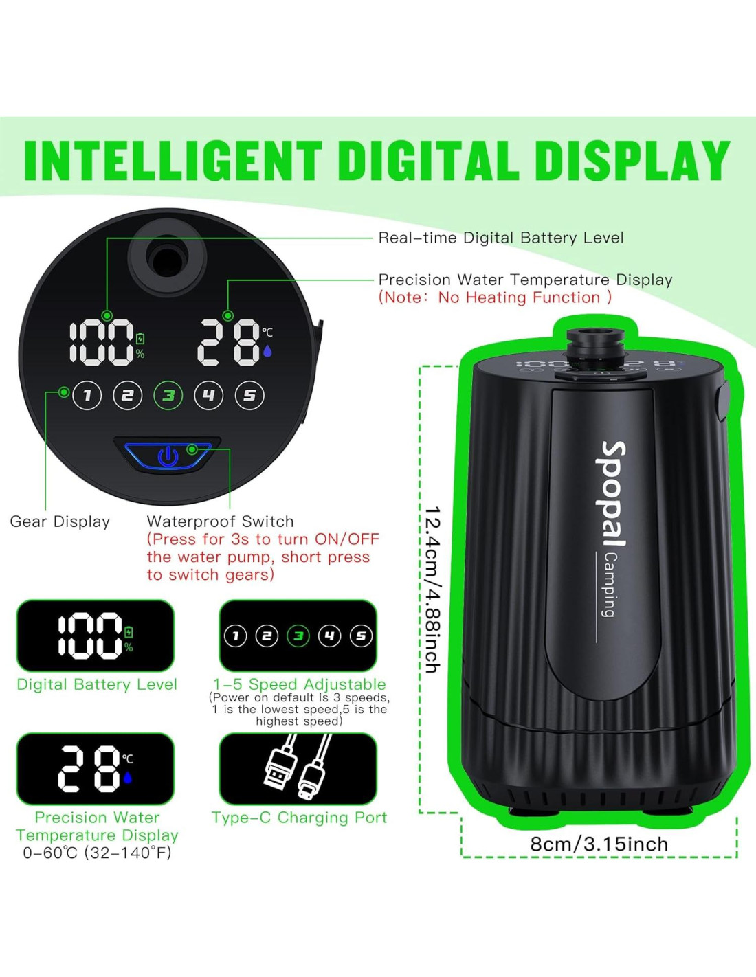 - PANTALLA LED PREMIUM MEJORADA. Nuestra ducha de camping portátil ahora viene con una pantalla LED mejorada. Muestra claramente el estado de la batería y la temperatura del agua. La temperatura puede variar de 0 - 60C, manteniéndote a salvo de quemaduras por calor. Además, puedes monitorear la energía, así que no más cortes inesperados durante tus viajes al aire libre.