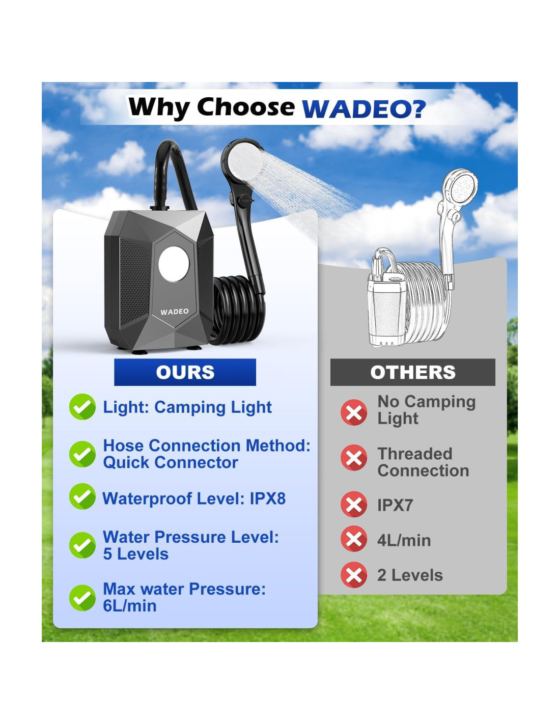 - [Batería de 6000mAh Mejorada para Mayor Tiempo de Uso] La ducha portátil WADEO para camping tiene una capacidad de batería de 6000mAh de larga duración, puede funcionar continuamente durante 180 minutos en solo 3 horas de carga. La bomba de ducha de camping con interfaz Type-C ofrece opciones de carga versátiles, puedes cargarla a través de tu cargador de teléfono (5V 0.5-2A), salida USB de laptop o salida USB de auto. Este puerto de carga está equipado con una cubierta de silicona impermeable para garantizar un uso seguro.