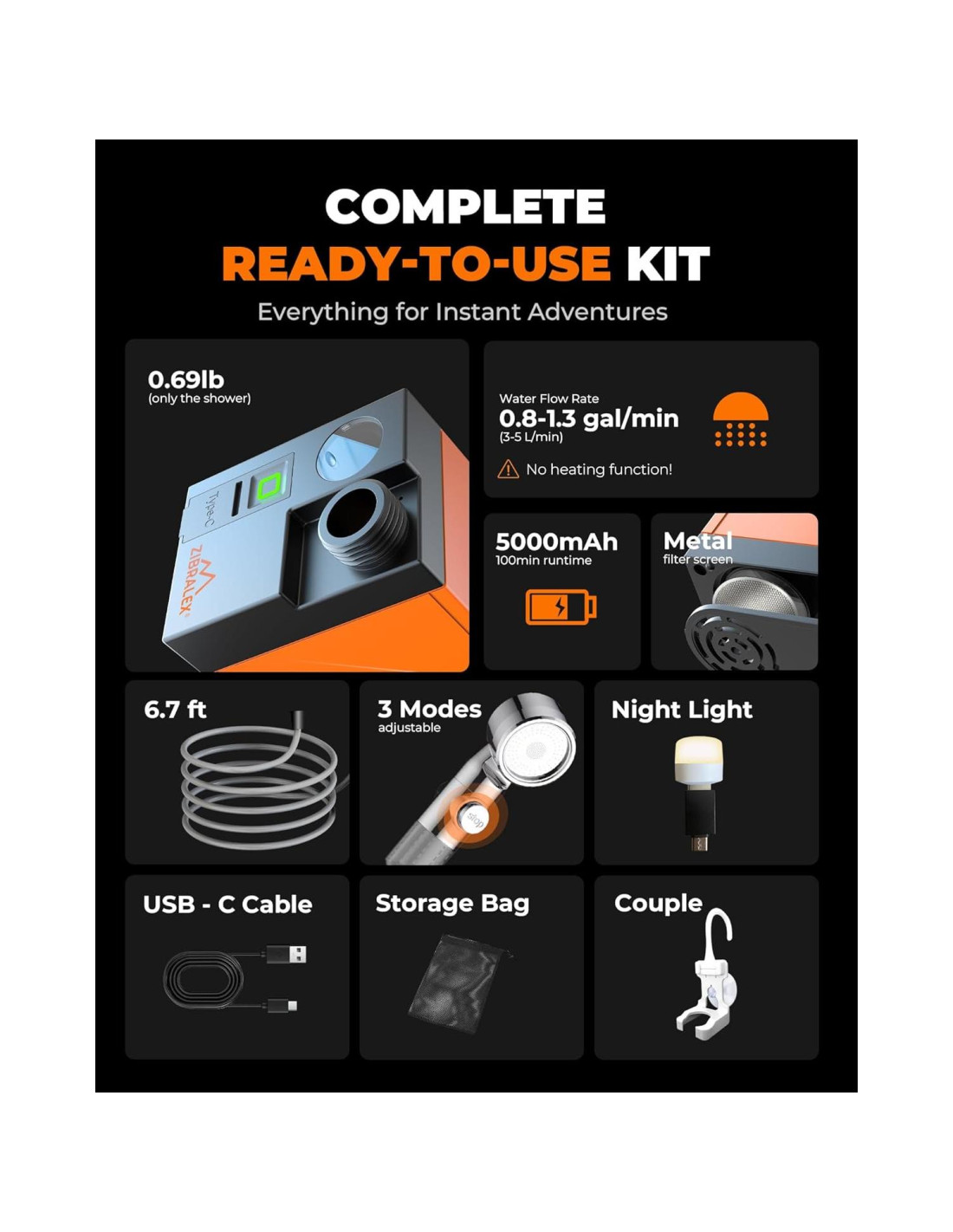 - [El Kit Completo Listo para Usar] - Tu aventura comienza justo al abrir la caja con este conjunto todo en uno. Incluye la Bomba de Ducha, manguera de 6.7 pies, cabezal de ducha de 3 modos, gancho versátil 3 en 1, cable USB-C, luz nocturna de bonificación, anillo de sellado de repuesto y una bolsa de almacenamiento duradera. Es la solución integral perfecta para camping, viajes en RV, baño de mascotas, mochileo y más.
