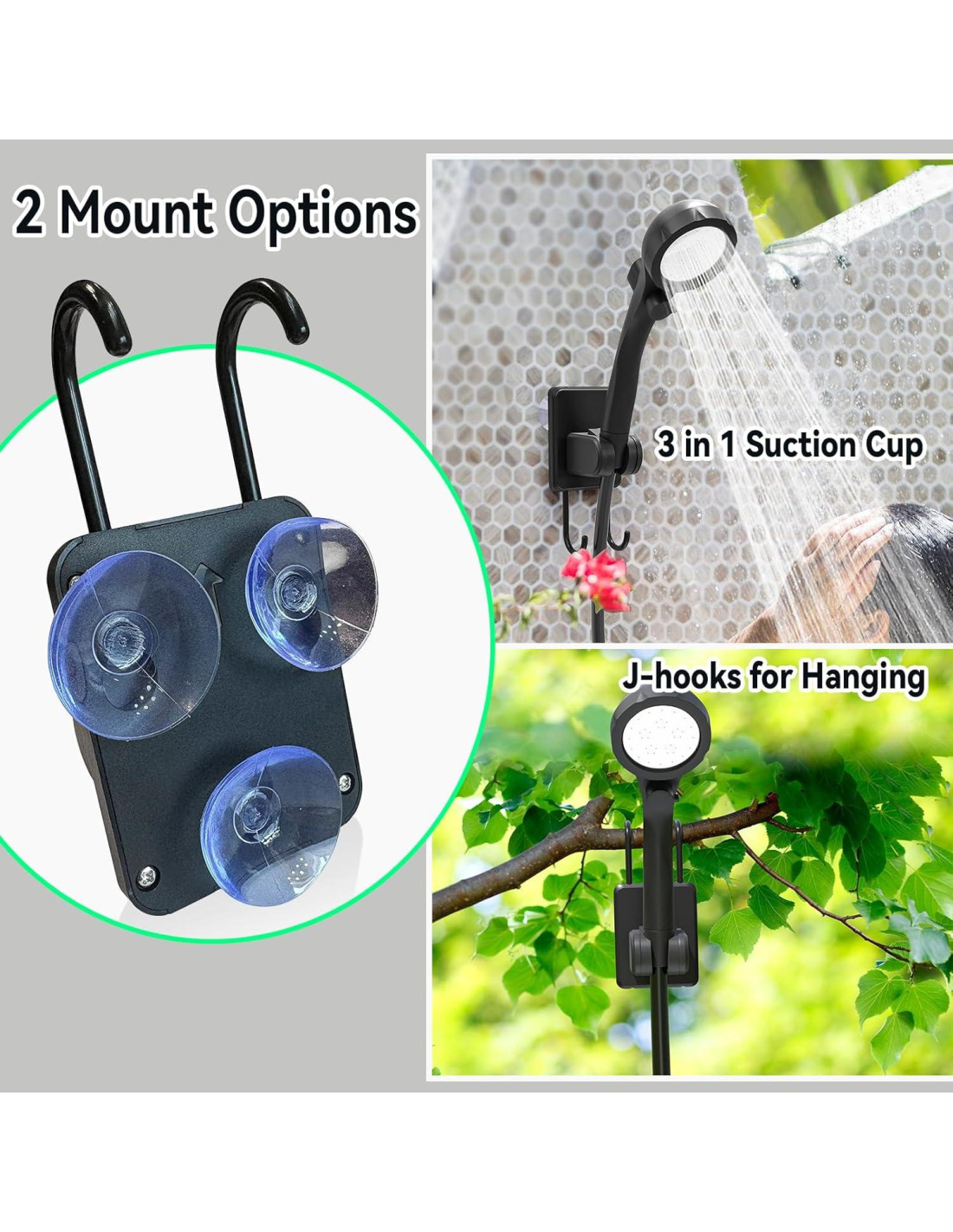 - 2 Opciones de Ducha: El kit de ducha exterior incluye un cabezal de ducha y un pulverizador de bidet, proporcionando opciones de limpieza versátiles para duchas interiores y exteriores, camping, senderismo, viajes a la playa, baño de perros y cuidado diario del jardín. El soporte de ducha versátil se puede montar en ventanas de automóviles y paredes lisas. También se puede colgar en postes de tiendas o ramas de árboles, permitiéndote disfrutar de una experiencia de ducha cómoda incluso durante tus aventuras al aire libre.