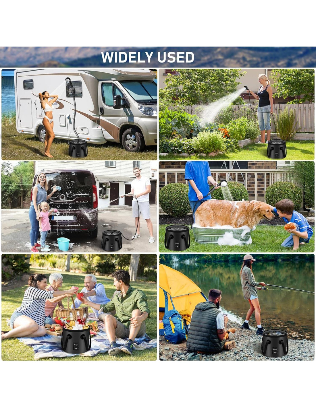 - Configuración Completa, Viaje Fácil El conjunto incluye una bomba de ducha, tubo de agua de 2 metros, cabezal de ducha multifuncional, bola de ducha, gancho tres en uno, cubo de agua plegable de 20L, bolsa de malla de almacenamiento, cable de carga Tipo-C y manual del usuario. Todos los accesorios se pueden almacenar en una bolsa de malla, que es ligera y fácil de llevar. Ya sea para ducharse al aire libre, acampar, hacer barbacoas, senderismo, jugar en la playa o bañar a los niños en familia, limpiar mascotas, lavar coches y regar, se puede manejar fácilmente.