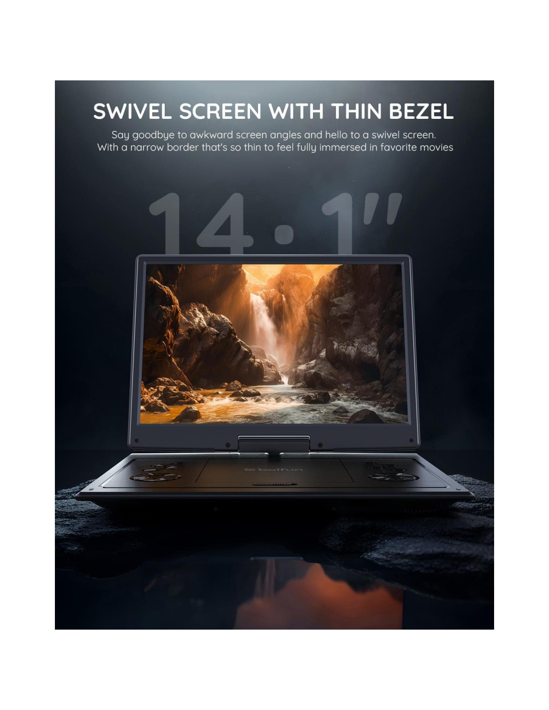 - [CALIDAD DE PANTALLA] Con tecnología de pantalla avanzada, la pantalla giratoria de 14.1" del reproductor de DVD BOIFUN brilla más y más clara que sus predecesores. Disfrute de claridad y viveza con su resolución de 1366*768