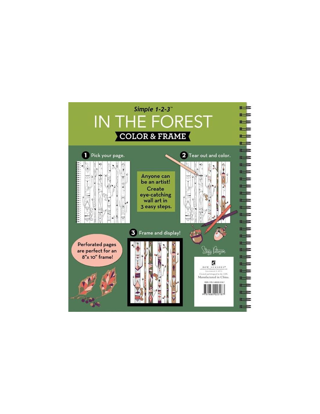 ¡Únete a millones de adultos alrededor del mundo que están redescubriendo la simple relajación y alegría de colorear! El libro para colorear Color y Marco - En el Bosque presenta el arte de Stacy Peterson. Páginas de colorear caprichosas llenan este libro - desde escenas del bosque, hasta erizos, setas y flores, cada página ofrece una experiencia de colorear imaginativa. ¡Disfruta cada momento mientras entras en el bosque! 31 imágenes para colorear. Páginas perforadas de un solo lado de 8"x10" (20,32 cm x 25,4 cm) permiten fácil desgarro para enmarcar o compartir. Papel más grueso ayuda a prevenir que los marcadores o bolígrafos traspasen a la siguiente página. Encuadernación en espiral permite que las páginas queden planas mientras coloreas. Las imágenes varían en complejidad. Este libro para colorear está hecho para adultos, pero ¡personas de todas las edades pueden disfrutarlo! 64 páginas
