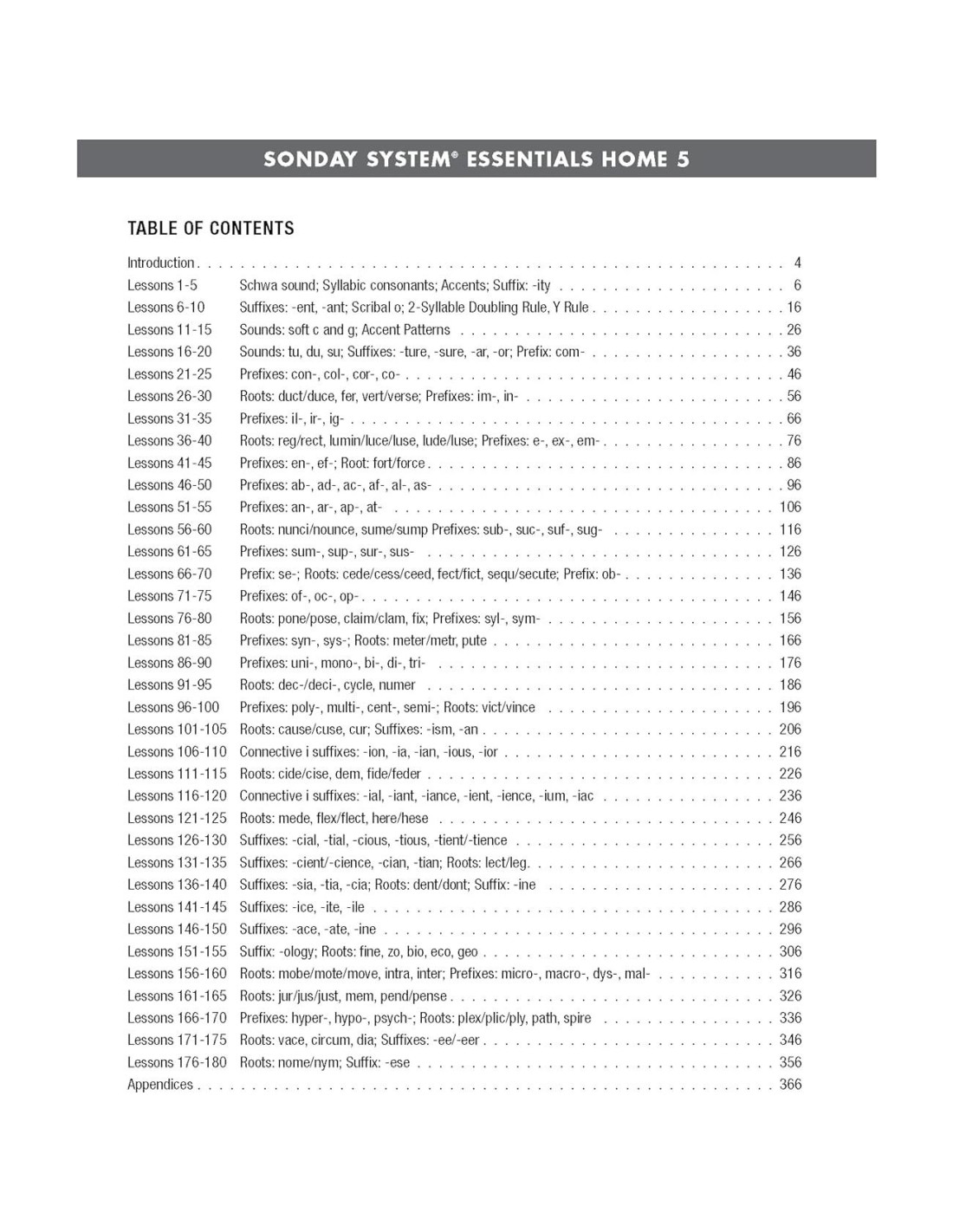 El Conjunto Esencial del Sistema Sonday para el Hogar incluye planes de lecciones diarios y materiales necesarios para proporcionar instrucción de lectura multisensorial en un entorno doméstico, así como evaluaciones para ayudar a los educadores a identificar y proporcionar intervención temprana para estudiantes con dificultades. Asignatura: lectura, ortografía, fonética, conciencia fonológica, fluidez, vocabulario, comprensión, escritura Entorno: educación en casa, instrucción de lectura básica Nivel de Grado: 5to grado Beneficios: flexibilidad, materiales no consumibles, planes de lecciones incluidos, multisensorial, alfabetización estructurada Materiales incluidos: guía del maestro (Libro de Plan de Aprendizaje), tarjetas didácticas, Kit de Medios