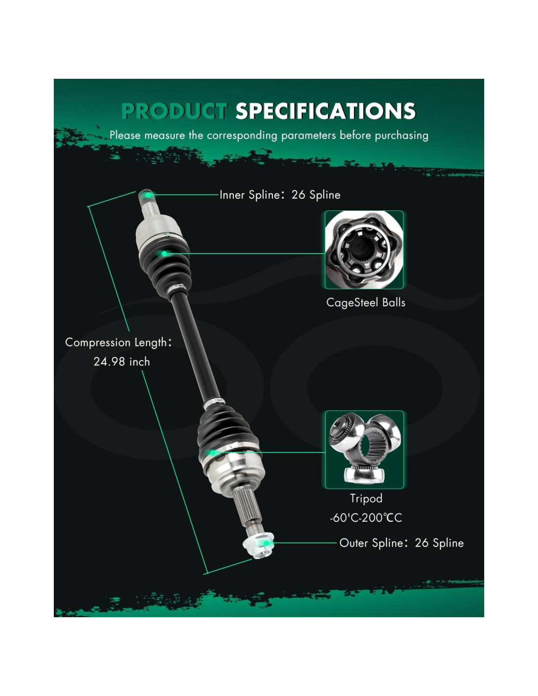 - Especificaciones: Ubicación: Lado del conductor delantero; Longitud total: aproximadamente 634 mm; Spline interno: 26 Spline; Spline externo: 26 Spline