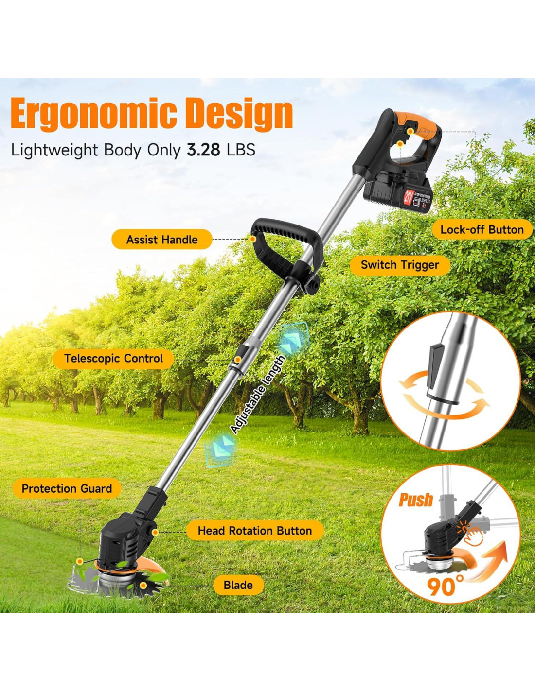 - Altura ajustable y cabeza giratoria: La cortadora de césped alimentada por batería tiene un poste telescópico ajustable con una tecla que puede ajustar la longitud de 34.6-47.2 pulgadas (87.8-119.8 cm). Proporciona la longitud requerida para todas las alturas sin necesidad de agacharse. Trabaja en una posición cómoda para reducir la presión en la cintura y los hombros. El ángulo de la cabeza de la cortadora es ajustable de 0-90, lo que te permite cuidar fácilmente cada rincón.