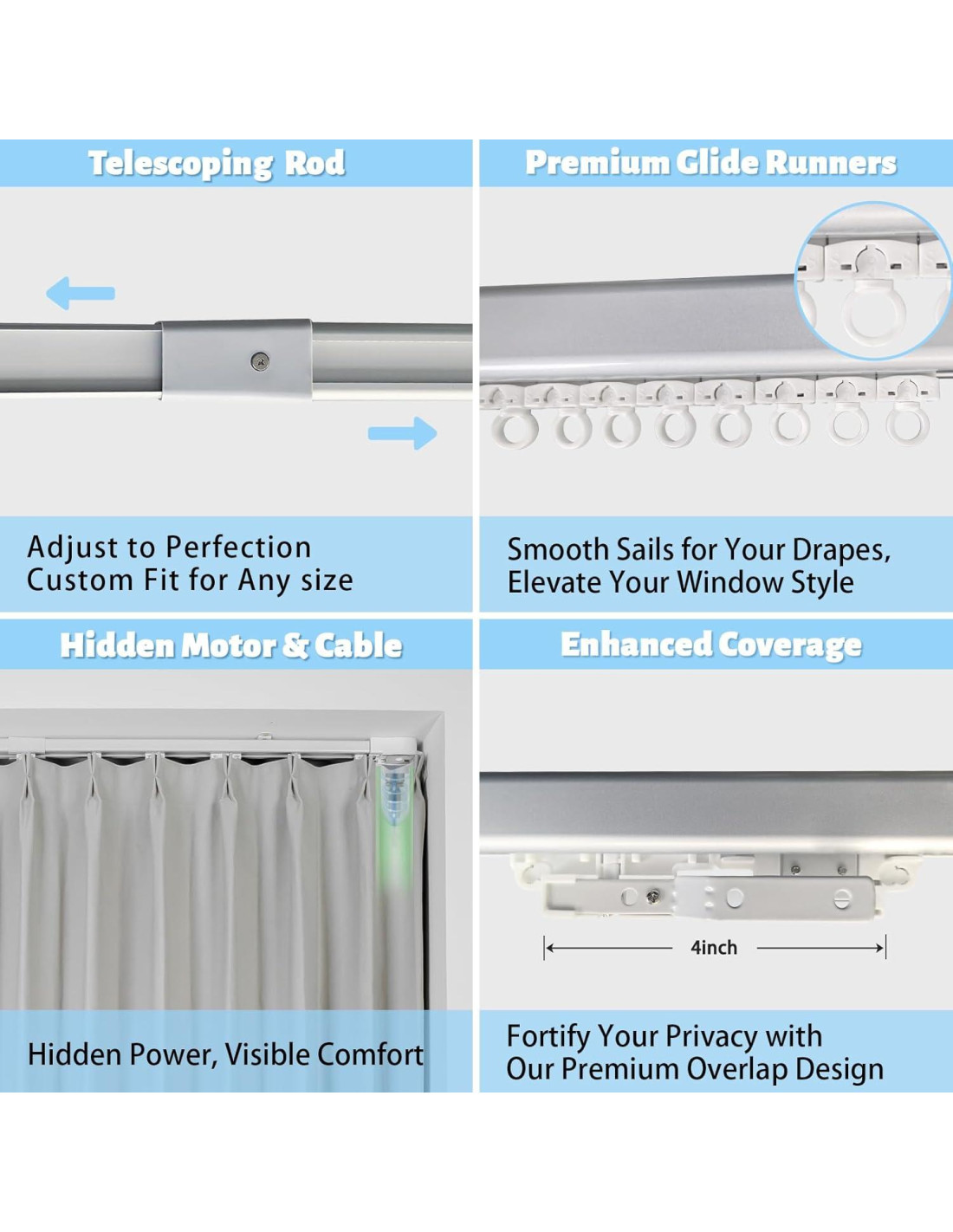 - FÁCIL DE INSTALAR No es necesario ensamblar rieles y correas molestos. El riel telescópico de una línea te permite configurar rápidamente y sin esfuerzo tus cortinas motorizadas únicas en solo unos pasos. Disfruta de la comodidad de las cortinas automatizadas en poco tiempo.