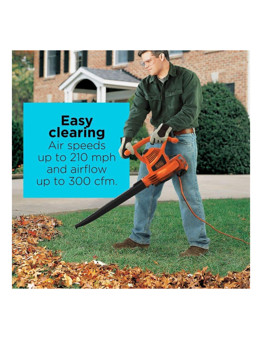 El soplador de hojas eléctrico 3-en-1 de 12 amperios de BLACK+DECKER + aspiradora de hojas + triturador es todo sobre versatilidad. Ya sea que uses este 3-en-1 como un soplador de hojas con cable para despejar hojas, recortes de césped y otros desechos de caminos y jardines, o como una aspiradora de hojas de alta resistencia para triturar desechos en mantillo, el motor de 12 amperios ofrece la potencia que necesitas: hasta 210 mph (338 km/h) de velocidad del aire y hasta 300 cfm (14.16 m/min) de flujo de aire. Además, este 3-en-1 está diseñado con un interruptor de 2 velocidades, para que puedas elegir la cantidad adecuada de potencia para cada tarea. La bolsa reutilizable para hojas es fácil de vaciar, mientras que el retenedor de cable incorporado mantiene todo enchufado y funcionando.