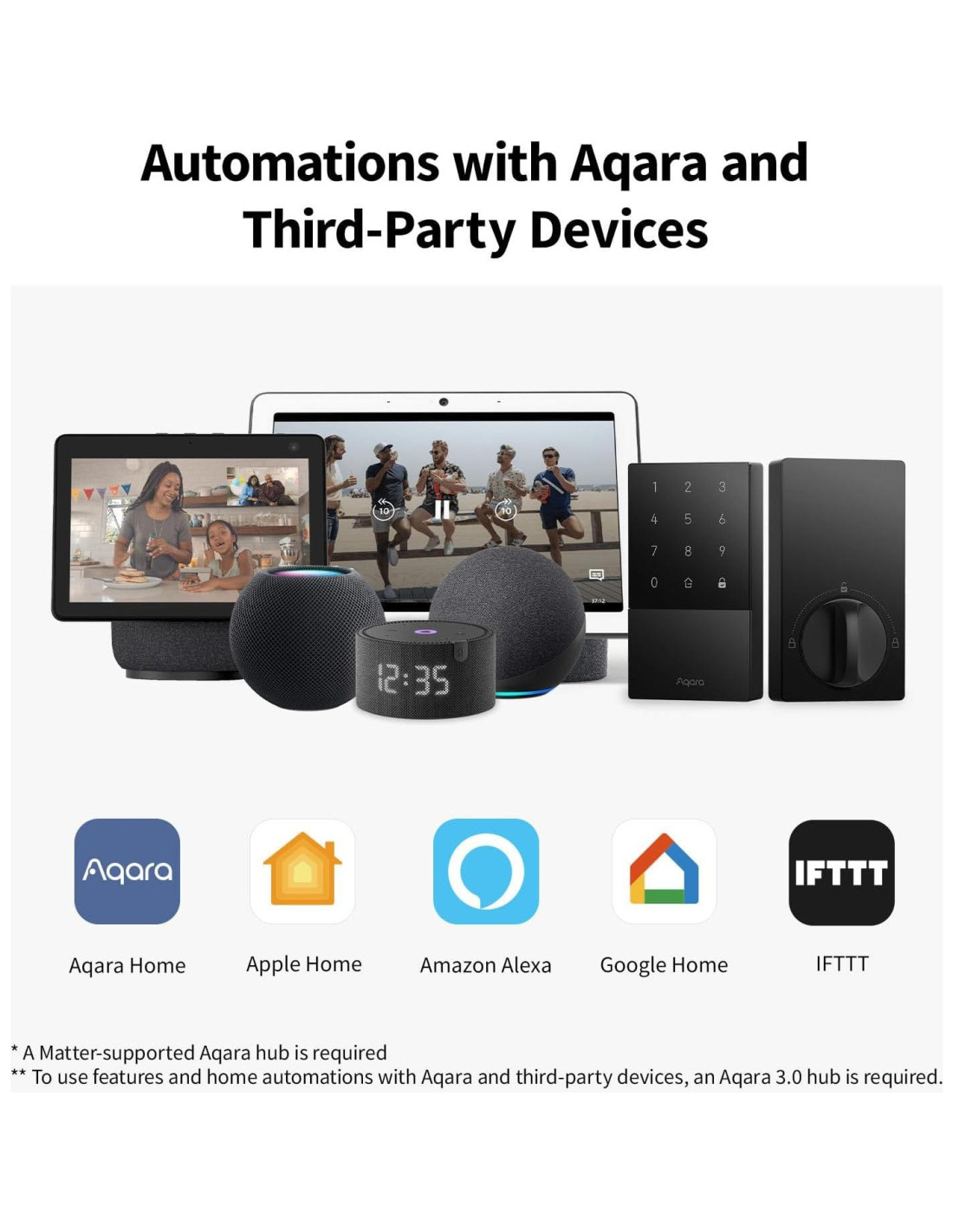 - [Automatizaciones con Dispositivos Aqara y de Terceros] Con un hub Aqara Zigbee 3.0, la cerradura de puerta inteligente U50 es compatible con ecosistemas de terceros como Google Home, Alexa e IFTTT, así como con la app Aqara Home, lo que permite integrarse fácilmente en una amplia gama de configuraciones de hogar inteligente y utilizarse en automatizaciones del hogar inteligente. Por ejemplo, cuando alguien presiona el Timbre de Video Aqara G4, podrás ver quién está en tu puerta y desbloquear fácilmente la cerradura U50.
