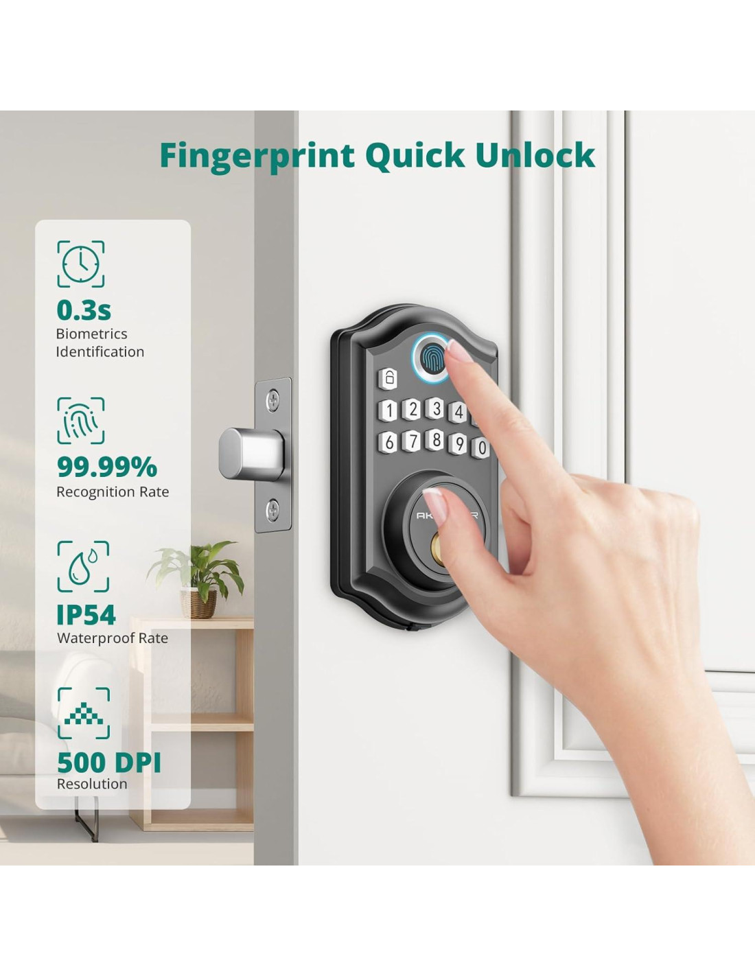 - Desbloqueo seguro por huella dactilar: La tecnología de identificación biométrica de huellas dactilares mejora la seguridad y permite a los usuarios desbloquear la puerta en un segundo sin llaves ni contraseñas engorrosas. La cerradura de puerta inteligente puede almacenar hasta 50 huellas dactilares de usuarios, reconociendo su huella dactilar en solo 0.3 segundos para un desbloqueo sin esfuerzo en 1 segundo.