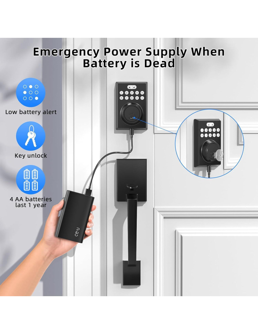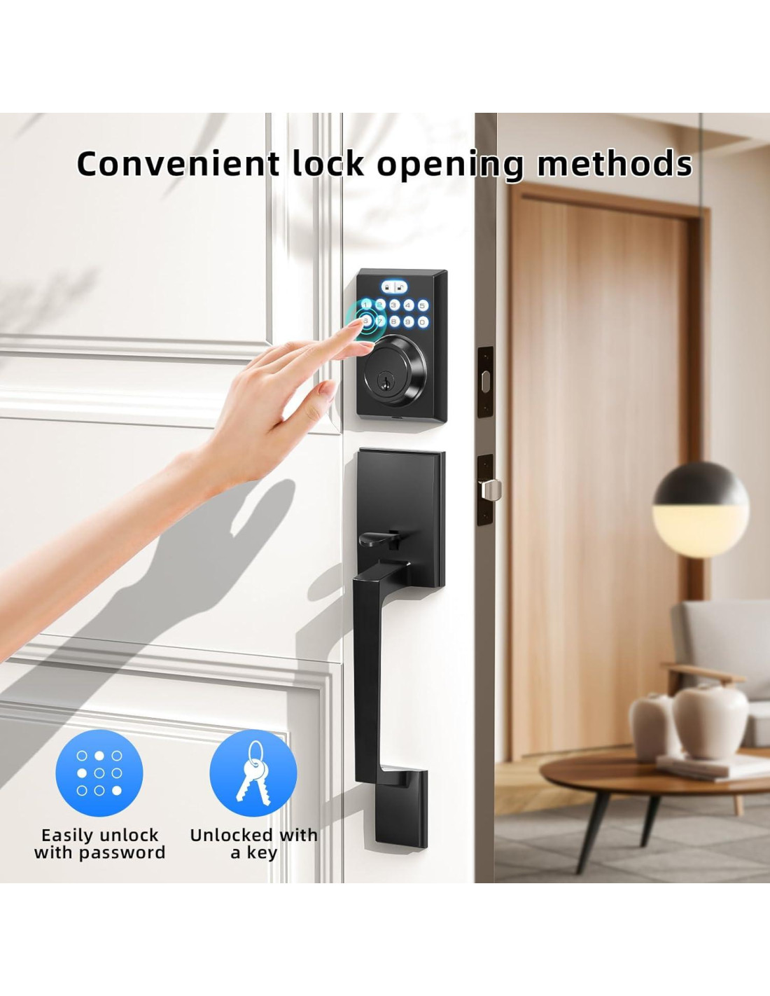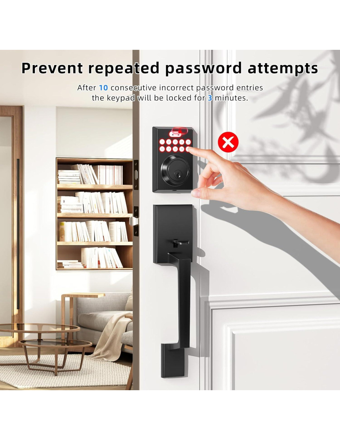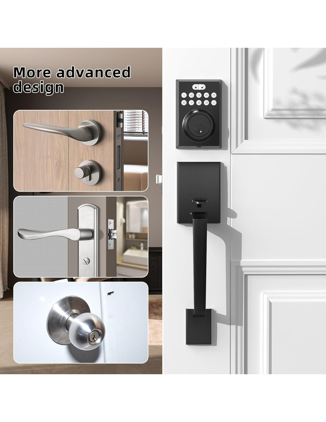 - Contraseña Anti-Ojeo y Cierre Automático: La cerradura de pestillo con juego de manija para la puerta de entrada cuenta con una función de contraseña falsa para evitar que otros ojeen tu contraseña. La función de cierre automático puede evitar que olvides cerrar la puerta.