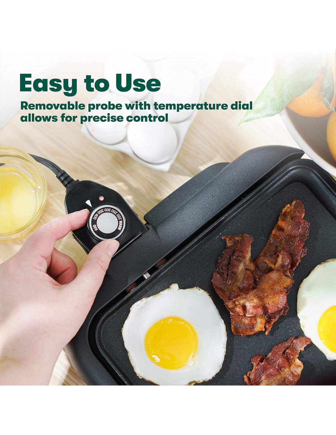 - CÓMODO: Con un dial de temperatura ajustable y sonda extraíble, esta plancha de cocina tiene todo lo que necesitas para un control preciso. La bandeja de goteo recoge grasa y jugos para una cocción más saludable, mientras que la bandeja calentadora mantiene la comida caliente hasta servir